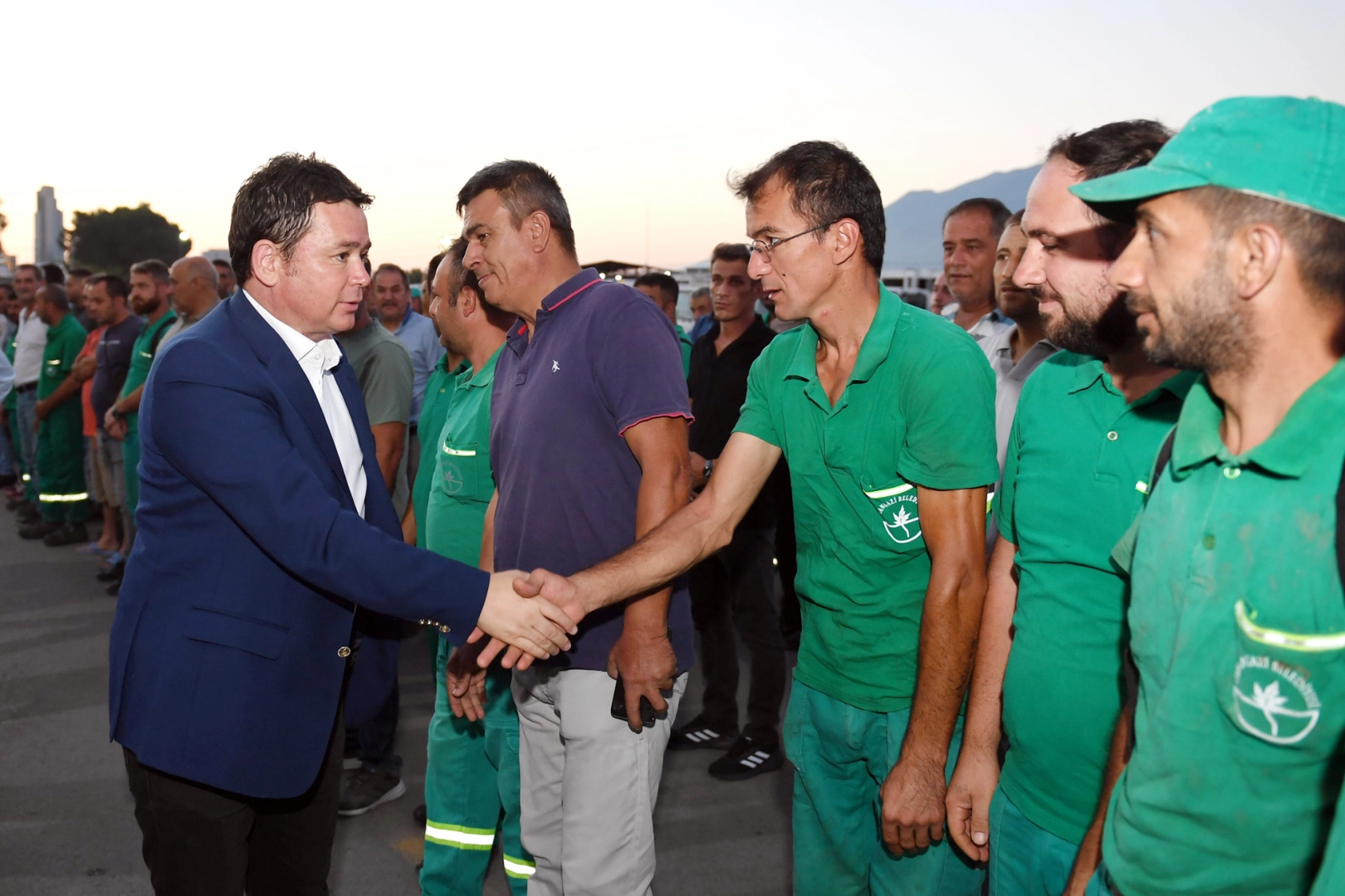 Yeni zam müjdesini duyunca büyük bir coşku yaşayan belediye işçileri, emeklerinin ve alın terinin karşılığını maaş bordrosuna yansıtmasından dolayı Başkan Erkan Aydın’a teşekkür etti. Başkan Aydın, sıcak sohbetin ardından günün ilk ışıklarıyla birlikte temizlik personelini görev yerlerine uğurladı.