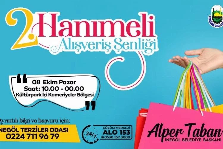 İnegöl Belediyesi ile Terziler Odası iş birliğinde 01 Ekim Pazar günü düzenlenmesi planlanan 2. Hanımeli Alışveriş Şenliği, yağış nedeniyle ertelendi. Hanımeli Alışveriş Şenliğinin 08 Ekim Pazar günü yapılacağı açıklandı. 8 Ekim’de de havanın yağışlı olması durumunda organizasyon Merpa Kapalı Pazar alanında gerçekleştirilecek.
