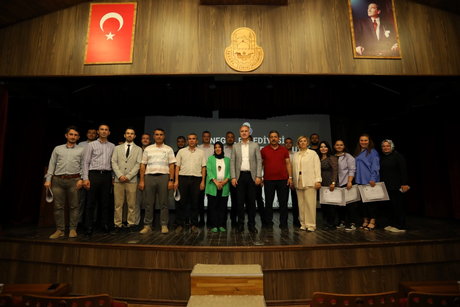 Halk Eğitim Merkezi iş birliğinde düzenlenen eğitimi başarıyla tamamlayan personeller için bugün 10.00’da İnegöl Kent Müzesi Konferans Salonunda sertifika töreni düzenlendi. Törene Belediye Başkanı Alper Taban da katıldı. Sertifika takdimi öncesi kürsüden personele yönelik bir konuşma yapan Başkan Alper Taban, “İnsan Kaynakları Müdürlüğümüzün birtakım eğitimleri ya da birtakım sizlerden gelen talepler üzerine oluşturduğu programlar olabiliyor. Ben bunların artarak devam etmesini arzu ediyorum. Burada da benzer bir programda farklı farklı müdürlüklerden arkadaşlarımız var. Katılan herkese teşekkür ediyorum” dedi.