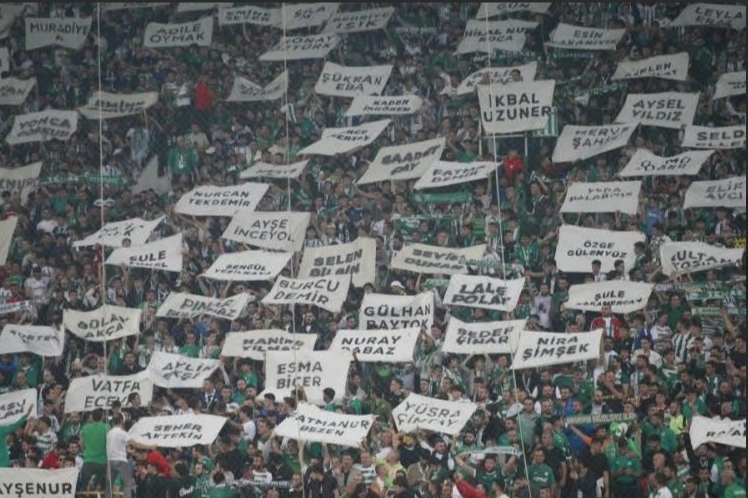 TFF 3. Lig’de mücadele eden Bursaspor’un taraftarları, 6. hafta mücadelesinde oynanan Bursaspor-Kahramanmaraş maçında, kadın cinayetlerine dikkat çekmek amacıyla hayatını kaybeden kadınların isimlerinin yazılı olduğu pankartlarla anlamlı bir farkındalık etkinliği düzenlemişti.