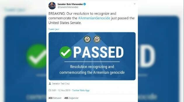ABD Senatosu, 1915 olaylarını ‘Ermeni Soykırımı’ olarak niteleyen tasarıyı geçirdi. Tasarı daha önce Temsilciler Meclisi’nde 11’e karşı 405 oyla kabul edilmiş ancak 3 kez Senato tarafından engellenmişti. Bu kez tasarı, Senato’da kabul edildi. New Jersey Senatörü Bob Menendez haberi Twitter hesabında paylaştı. Menendez paylaşımında, “Ermeni Soykırımını tanıma ve anma kararımız ABD Senatosu’ndan yeni geçti” yazdı.