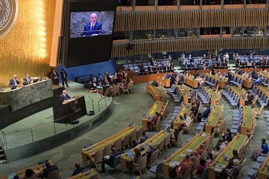 Gazze Şeridi'nde soykırımını yaklaşık 1 yıldır sürdüren İsrail'in Başbakanı Binyamin Netanyahu, Birleşmiş Milletler (BM) 79. Genel Kurulu'nda tepkiyle karşılandı. Netanyahu kurula hitap etmek üzere kürsüye çıktığı sırada başta Türk heyeti olmak üzere çok sayıda ülke temsilcisi, İsrail başbakanını protesto etmek amacıyla salonu terk etti. Netanyahu konuşmasını çoğu boş olan sandalyeler önünde gerçekleştirdi.