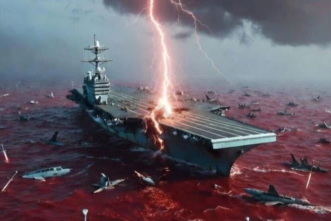 İran Devrim Muhafızları Ordusu, son dönemde artan bölgesel gerilim ve ABD'ye ait askeri unsurların bölgedeki varlığına dikkat çeken bir görsel paylaştı. Görselde, İran'a yakın bölgede konuşlu bulunan ve ABD Başkanı Donald Trump'ın son açıklamalarında sık sık tehdit unsuru olarak gündeme getirdiği USS Abraham Lincoln uçak gemisinin fırtınalı ve kan kırmızısı tonların hakim olduğu bir denizde hedef alındığı sahne yer aldı. Paylaşımda, uçak gemisine isabet eden bir yıldırımın yanı sıra ABD'ye ait savaş uçaklarının denize düşerek batmış şekilde tasvir edildiği, denize saplanmış kılıç figürlerinin öne çıktığı görüldü. Görselde ayrıca Saf Suresi'nin 13'üncü ayeti olan "Allah'tan bir yardım ve yakın bir fetih" ifadesine yer verildi.