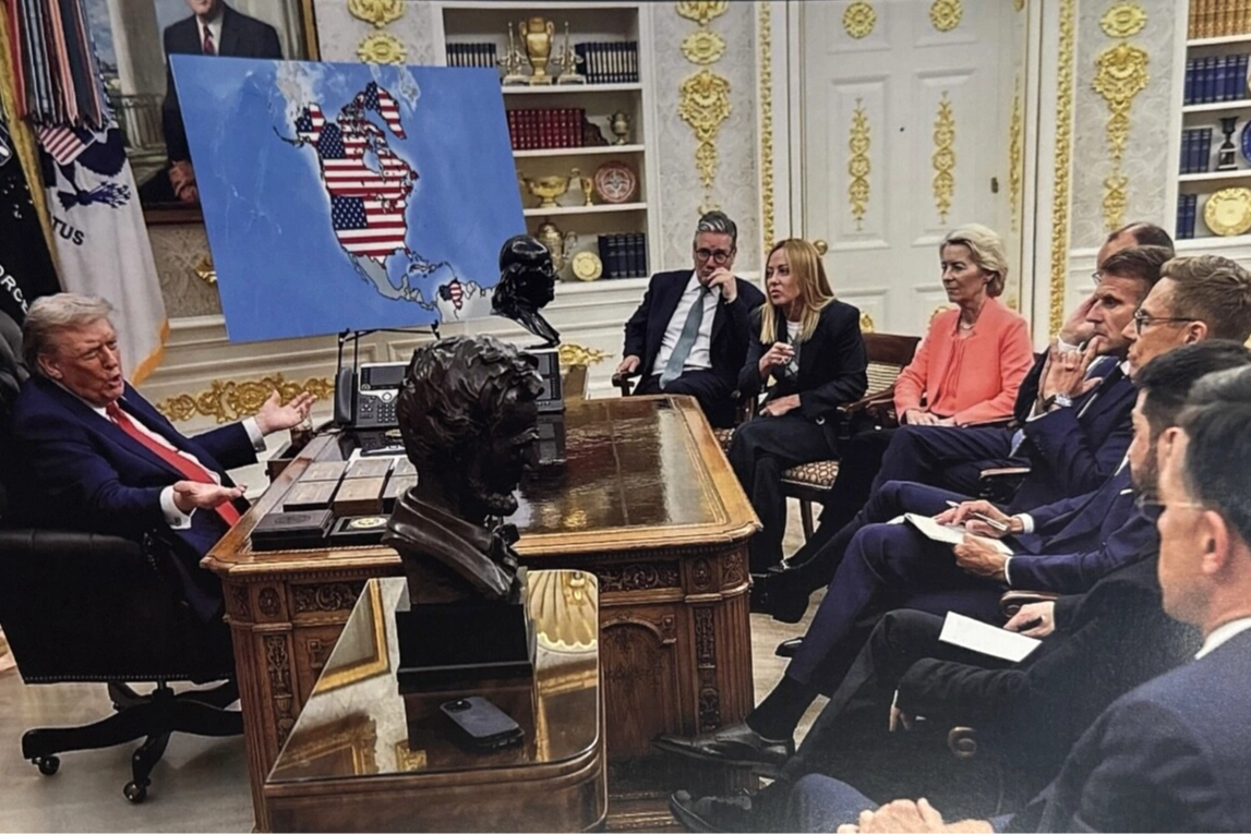 ABD Başkanı Donald Trump, ABD'nin Venezuela'ya yönelik saldırı ve askeri operasyonu ile Devlet Başkanı Nicolas Maduro'yu alması ve Grönland'a yönelik adımları gündemde yerini korurken, kendisine ait sosyal medya hesabı Truth Social'dan yaptığı yeni bir paylaşımla tartışmaların fitilini bir kez daha ateşledi. Trump ve Avrupalı liderlerin bir toplantı yaptığı görülen fotoğrafta masanın yanı başında bir dünya haritası yer alıyor. Haritada Kanada, Grönland ve Venezuela ise ABD toprağı olarak gösterildi.