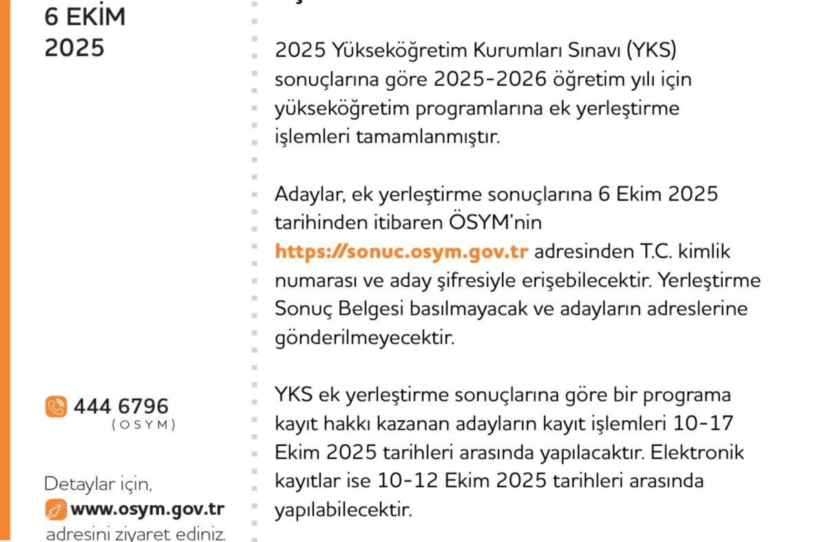 2025 YKS ek yerleştirme sonuçları, Öğrenci Seçme ve Yerleştirme Merkezi (ÖSYM) sitesinde açıklandı. Adayların, ek yerleştirme sonuçlarına 6 Ekim 2025 tarihinde saat 16.30'dan itibaren ÖSYM'nin resmi sitesinden T.C. kimlik numarası ve aday şifresiyle erişebilecekleri belirtildi. ÖSYM'nin sosyal hesabından yapılan paylaşımda şu ifadeler yer verildi: "2025 Yükseköğretim Kurumları Sınavı (YKS) sonuçlarına göre 2025-2026 öğretim yılı için yükseköğretim programlarına ek yerleştirme işlemleri tamamlanmıştır. Adaylar, ek yerleştirme sonuçlarına 6 Ekim 2025 tarihinde saat 16.30'dan itibaren ÖSYM'nin https://sonuc.osym.gov.tr adresinden T.C. kimlik numarası ve aday şifresiyle erişebilecektir. Yerleştirme Sonuç Belgesi basılmayacak ve adayların adreslerine gönderilmeyecektir. YKS ek yerleştirme sonuçlarına göre bir programa kayıt hakkı kazanan adayların kayıt işlemleri 10-17 Ekim 2025 tarihleri arasında yapılacaktır. Elektronik kayıtlar ise 10-12 Ekim 2025 tarihleri arasında yapılabilecektir. Kayıt için adayların yerleştirildikleri yükseköğretim programının bağlı bulunduğu üniversiteye süresi içinde başvurmaları gerekmektedir. Elektronik kayıt yapan adaylar, üniversiteleri tarafından duyurulan tarihe ve ilgili belgelere göre işlem yapacaktır. Ek yerleştirme sonuçlarına ilişkin sayısal bilgiler Ek'te sunulmuştur."