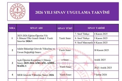 Milli Eğitim Bakanlığı 2026 yılının sınav uygulama takvimini yayımladı. Takvime göre; Sınavla Öğrenci Alacak Ortaöğretim Kurumlarına İlişkin Merkezi Sınav (LGS) 14 Haziran 2026 Pazar günü, İlköğretim ve Ortaöğretim Kurumları Bursluluk Sınavı (İOKBS) 26 Nisan 2026 Pazar günü yapılacak.