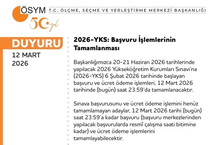 MEB tarafından 20-21 Haziran tarihlerinde yapılacak 2026 Yükseköğretim Kurumları Sınavı’na (2026-YKS) 6 Şubat tarihinde başlayan başvuru ve ücret ödeme işlemleri, bugün saat 23.59’da tamamlanacak. Sınava başvurusunu ve ücret ödeme işlemini henüz tamamlamayan adaylar, bugün saat 23.59’a kadar başvuru (başvuru merkezlerinden yapılacak başvurularda resmi çalışma saati bitimine kadar) ve ücret ödeme işlemlerini tamamlayabilecek.