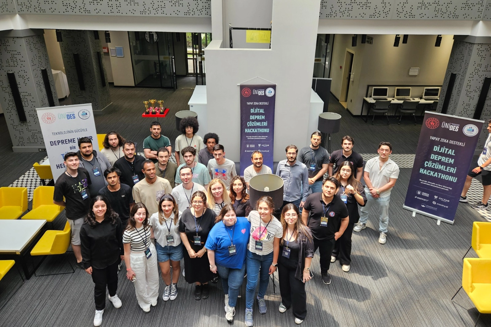 Mimar Sinan Yerleşkesi’nde, Endüstri ve Dijital Dönüşüm Topluluğu tarafından organize edilen Dijital Deprem Çözümleri Hackathonu, Gençlik ve Spor Bakanlığı ÜNİDES desteğiyle hayata geçirildi. 11 farklı takımdan oluşan 40 üniversite öğrencisi, 32 saat boyunca aralıksız çalışarak afetlere yönelik dijital çözümler üretti. Etkinlik süresince öğrenciler; deprem öncesi hazırlık, anlık müdahale ve sonrası iyileştirme süreçlerine odaklanan yazılım projeleri geliştirdi. Yarışmada birinciliği, Bursa Uludağ Üniversitesi Yönetim Bilişim Sistemleri öğrencilerinden oluşan İHAWK Takımı kazandı. Deprem sonrası yıkım tespiti ve sektörleme yapabilen bir insansız hava aracı sistemi geliştiren takım; Merve Subaşı, Ömer Turhan, Mehmet Sahaf Bayrakçı, Mohamad Alchekh ve Besmullah Nikzada’dan oluştu.