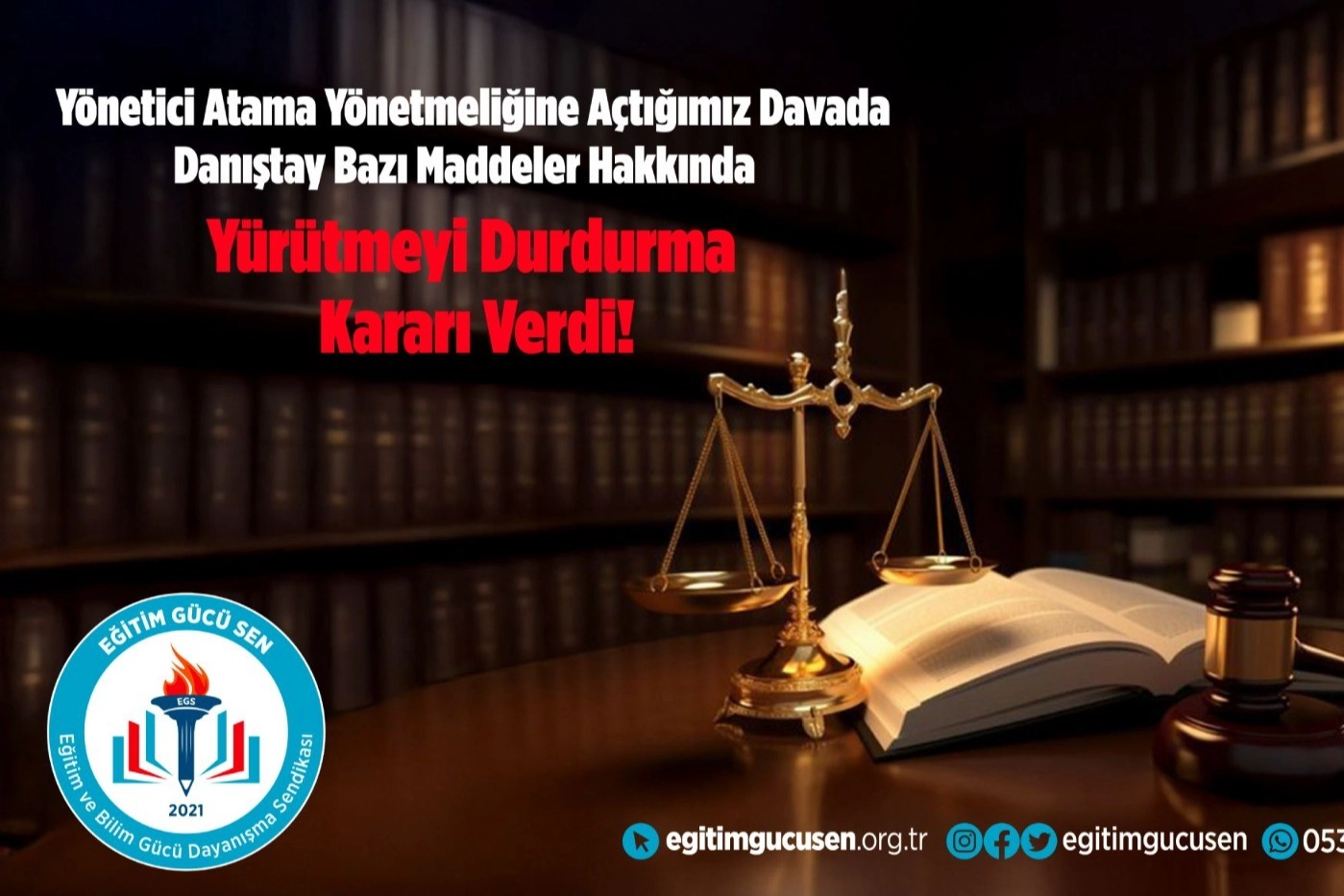 Eğitim-Gücü-Sen tarafından yapılan yazılı açıklamada, "32476 Sayılı Resmi Gazete'de yayınlanan Milli Eğitim Bakanlığı'na Bağlı Eğitim Kurumlarının Yönetici Seçme ve Görevlendirme Yönetmeliği'nde Değişiklik Yapılmasına Dair Yönetmelik'in bazı maddelerinin iptaline yönelik sendikamız adına Danıştay İkinci Daire'de açmış olduğumuz davada Danıştay sendikamızı aşağıdaki gerekçelerle haklı bularak, yürütmeyi durdurma kararı vermiştir. Bu kararla birlikte yönetici belirleme kriterlerinde yönetici adaylarının hangi alanlarda yüksek lisans ve doktora yapıldığına bakılmaksızın bir değerlendirme yapılması gerektiği ortaya konmuştur. Ek 2 Değerlendirme Formu konusunda yönetici adaylarının 'Cezalar' kısmının formdan kaldırılmasının hukuka aykırı olduğuna karar verilmiştir. Bunun yanında sendikamız tarafından iptali istenen diğer maddeler için Danıştay süreci nihai kararı beklenmektedir. Hukuka aykırılığı açıkça ortaya konan ve Danıştay tarafından yürütmenin durdurulmasına karar verilen durumlarla ilgili Milli Eğitim Bakanlığı'nın mevzuat düzenlemeleri yapması gerektiği de açıktır. Eğitim Gücü-Sen olarak sahada yaşanan bir mağduriyeti çözmekle birlikte öğretmenlerin ve eğitim çalışanlarının her türlü özlük ve mali haklarını savunmaya, bu konularda mücadele etmeye devam edeceğiz" denildi.