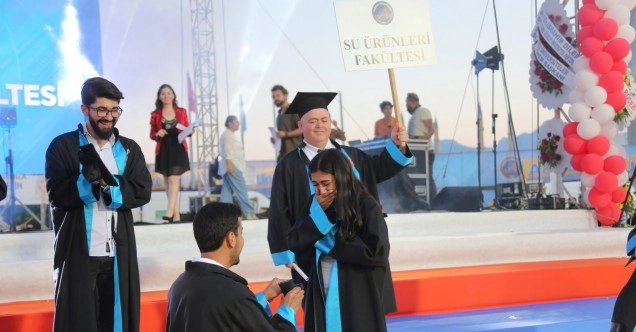 Akdeniz Üniversitesi 2021-2022 Akademik Yılı Mezuniyet Töreni’nde yaklaşık 10 bin öğrenci mezun oldu. Törenin sürprizi ise Su Ürünleri Fakültesi’nde yaşandı. Fakültesini birincilikle bitirerek törende yaş kütüğüne plaket çakan Gamze Yapıcı’ya tam bu sırada okul arkadaşı Mehmet Şimşir diz çökerek evlilik teklifi yaptı. Büyük heyecan yaşayan ve gözyaşlarını tutamayan Gamze Yapıcı sürpriz teklife ‘evet’ dedi.