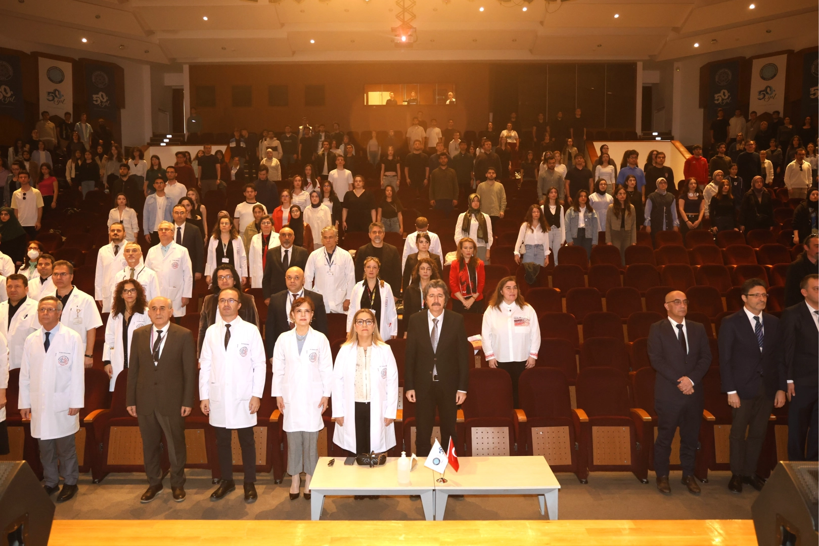 Konuşmasında öğrencilere seslenen Dekan Coşkun, “Sizler geleceğin hekimleri olarak bilimin ışığında ilerleyen, insan hayatına dokunmaya hazırlanan birer meşale taşıyorsunuz. Tıp eğitimi zorlayıcı olabilir. Bazen size tükenmişlik hissi verebilir ama unutmayın ki her zorluk sizi daha donanımlı, daha güçlü ve daha bilinçli bir hekim haline getiriyor. Gelecekte bir hastanın gözlerindeki umudu görmek, bir teşhisle hayat kurtarmak, bir dokunuşta şifa vermek… İşte tüm bu fedakârlıkların anlamı burada saklı. Mesleğinizde sabırlı olun. Her daim öğrenmeye açık olun ve en önemlisi vicdanınızı asla kaybetmeyin. Çünkü iyi bir hekim sadece bilgisiyle değil, merhametiyle ve insan sevgisiyle de fark yaratır” ifadelerini kullandı.
