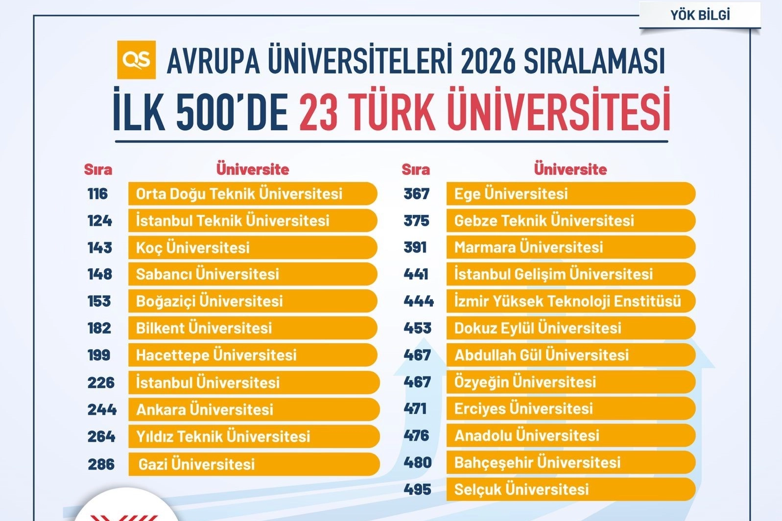 Türk üniversiteleri, uluslararası sıralamalardaki başarıları ile adından söz ettiriyor. QS Avrupa Üniversiteleri 2026 sıralamasında Türkiye’den 23 üniversite ilk 500’e girmeyi başardı. Toplam 103 üniversitesi sıralamalarda yer alan Türkiye; Almanya, Fransa, İtalya ve İspanya gibi köklü yükseköğretim sistemlerini geride bırakarak Avrupa’da en fazla temsil edilen ikinci ülke konumuna yükseldi. Times Higher Education (THE) tarafından açıklanan ‘2026 Alan Bazlı Dünya Üniversiteleri Sıralamaları’nda Türk üniversiteleri, QS sıralamalarında da yükselişini sürdürdü. ODTÜ, 116’ncı olarak en yüksek dereceli üniversite oldu 42 ülke ve bölgeden 958 üniversitenin yer aldığı sıralamalarda Orta Doğu Teknik Üniversitesi (ODTÜ) 116’ncı olarak Türkiye’nin en yüksek dereceli üniversitesi olurken, akademik itibar, işveren itibarı ve uluslararası araştırma ağı göstergelerinde lider oldu. Sıralamalarda İstanbul Teknik Üniversitesi 124’üncü, Koç Üniversitesi 143’üncü, Sabancı Üniversitesi 148’inci olarak ilk 150 üniversite arasında yer alırken, onları 153’üncü sırada yer alan Boğaziçi Üniversitesi takip etti.