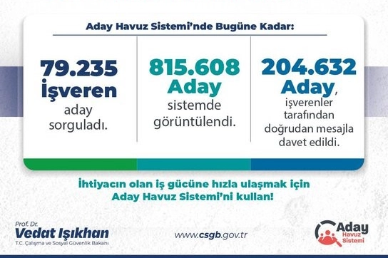 Çalışma ve Sosyal Güvenlik Bakanı Vedat Işıkhan, Aday Havuz Sistemi'ne ilişkin sosyal medya hesabından açıklamalarda bulundu. Bakan Işıkhan, 79 bin 235 işveren tarafından 815 bin 608 iş arayan vatandaşın sistemde görüntülendiğini aktararak, şu ifadelere yer verdi: "Aday Havuz Sistemimiz sayesinde iş arayan vatandaşlarımız ile işverenleri aynı platformda buluşturuyoruz. Geçtiğimiz yılın Eylül ayından bugüne 79 bin 235 işveren tarafından 815 bin 608 iş arayan vatandaşımız sistemde görüntülendi. Bu görüntülemeler sonucunda 204 bin 632 iş arayan vatandaşımız ile iletişime geçildi. Yenilikçi politikalarımız ile istihdamımızı destekleyecek, iş gücü piyasasını daha verimli hale getireceğiz."