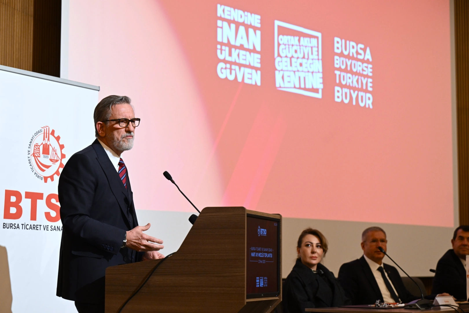 BTSO Mart Ayı Olağan Meclis Toplantısı, iş dünyasının yaşam boyu eğitim merkezi Bursa Business School’da meclis üyelerinin yoğun katılımıyla gerçekleştirildi. Toplantıda konuşan İbrahim Burkay, küresel ticaretteki köklü bir değişim ve dönüşüm sürecinin başladığını belirterek, “Dünyadaki değişim, 19. yüzyıldaki sanayi devrimi gibi önemli bir dönüm noktasını işaret ediyor. Bugün ekonomi ve sanayi alanında bağımsızlık, her zamankinden daha önemli.” dedi. Türkiye’nin başta savunma sanayi, uzay ve havacılık alanlarında olmak üzere son 20 yılda büyük atılımlar gerçekleştirdiğini belirten İbrahim Burkay, “İşte bu atılımlar gerçekleştirilirken Türkiye'nin dönüştürücü ve en büyük itici gücü de Bursa'mız oldu. Bursa, Türkiye’nin ekonomik yapısında her zaman ilk beşte yer aldı ve büyük bir üretim merkezi olarak ön plana çıktı. Hem tarihi mirası hem de modern girişimcilik anlayışıyla, Bursa, Türkiye’nin ekonomik dönüşümüne öncülük etmeye devam ediyor.” şeklinde konuştu.