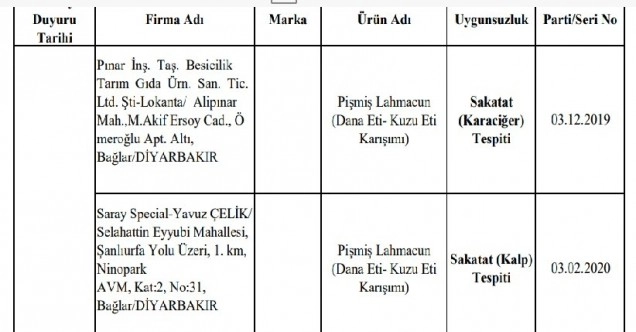 Tarım ve Orman Bakanlığı tarafından, kişilerin hayatını ve sağlığını tehlikeye düşürecek şekilde bozulmuş, değiştirilmiş gıdaları üreten ve satan firmalar paylaşıldı. Tarım ve Orman Bakanı Bakanlığı sitesinden yaptığı açıklamada, taklit, tağşiş yapıldığı veya ilaç etken maddesi ilave edildiği tespit edilen toplam 69 firmaya ait 136 parti ürünün listesinin kamuoyuyla paylaşıldığı ifade edildi. Açıklamada, “Tarım ve Orman Bakanlığının yaptığı kontroller sonucunda sahip olduğu bilgileri, 5996 sayılı ‘Veteriner Hizmetleri, Bitki Sağlığı, Gıda ve Yem Kanunu’nun 31’inci maddesinin 6’ncı fıkrası uyarınca kamuoyunun bilgisine sunabileceği hükme bağlanmıştır. Ayrıca, 17 Aralık 2011 tarihli Gıda ve Yemin Resmi Kontrolüne Dair Yönetmeliğin 8’inci maddesi gereğince laboratuvar sonucu ile taklit ve tağşiş yapıldığı kesinleşen gıda ve yemi üreten/ithal eden firmanın adı, ürün adı, markası, parti ve-veya seri numarasının Bakanlık resmi internet sitesinde Bakanlıkça kamuoyunun bilgisine sunabileceği hükmü yer almaktadır. Bu kapsamda, laboratuvar sonucu ile kişilerin hayatını ve sağlığını tehlikeye düşürecek şekilde bozulmuş ve değiştirilmiş ürünlere ait bilgiler ile taklit-tağşiş yapılmış ürünlere ait bilgiler aşağıda yer almaktadır" denildi.