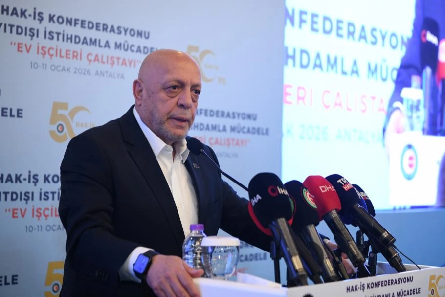 Antalya'da HAK-İŞ Konfederasyonu tarafından "Kayıtdışı İstihdamla Mücadele Ev İşçileri" konulu çalıştay, Çalışma ve Sosyal Güvenlik Bakanı Vedat Işıkhan'ın katılımıyla gerçekleştirildi. Bir otelde düzenlenen program, saat 09.30'da saygı duruşu ve İstiklal Marşı'nın okunmasıyla başladı. Açılış bölümünde HAK-İŞ Konfederasyonu'nun 50. Yıl Filmi gösterildi. Ardından Hizmet-İş Sendikası Komitesi Başkanı Hatice Ayhan ile HAK-İŞ Kadın Komitesi Başkanı Fatma Zengin konuşmalarını yaptı. "Mazlumların bizden alacağı var" HAK İŞ Genel Başkanı Mahmut Arslan yaptığı konuşmada, "Bugün sendikal hareketin, Türk endüstri ilişkileri sistemi açısından ne kadar önemli bir görevi üstlendiğini bir kez daha görüyoruz. Bu mücadelemizde destek veren, yanımızda olan, bizimle heyecanlanan, bizimle birlikte geleceğe umutla bakan herkese başta Sayın Bakanımız olmak üzere emeği geçen herkese teşekkür ediyorum. Allah hepinizden razı olsun. Biz ülkemizin, bölgemizin ve küremizin tüm mağdur ve mazlumlarının bizden alacaklı olduğuna inanıyoruz. Genel kurul kararımız da bize bu sorumluluğu yükledi. Bu sorumluluğun farkındayız. Dünyanın herhangi bir köşesinde, inancı, dili, yaşadığı coğrafya ne olursa olsun bir mazlum varsa onun yanında olmak zorundayız. Çünkü onların bizden alacakları var ve bizim de bu borcu ödememiz gerekiyor" dedi. "Taşeron mücadelesi önemli bir başarı hikâyesi yazdı" "Ülkemizin mazlumları ve mağdurları için de sorumluluklarımız var, bunları yerine getirmek zorundayız" diyen Arslan, "1980'li yılların sonunda işçilerinin Borçlar Kanunu kapsamından çıkarılarak İş Kanunu kapsamına alınması için başlattığımız büyük fakat zorlu mücadeleyi, Allah'a şükür başarıyla tamamladık. İş Kanunu'nda yapılan düzenlemelerle bu işçiler için önemli bir başarı hikâyesi yazdık. Türkiye'nin ne yazık ki köleleri olmuş meselelerinden biri olan kamuda taşeron işçileri konusunda da vazgeçilmez ve geri adım atmayan bir mücadele yürüttük. Aylar değil, yıllar süren zorluklarla karşılaştık fakat sonunda taşeron işçilerini kamu çalışanı kadrosuna dahil ederek önemli bir kazanım elde ettik" diye konuştu. Kayıt dışı istihdama karşı net bir duruş Bugün ev işçilerinin sendikal örgütlenmesi, İş Kanunu kapsamına alınması, sosyal güvenlik sisteminden tam olarak yararlanması ve toplu sözleşme haklarına kavuşması için yürüttükleri mücadelede de aynı kararlılığı sürdürdüklerini belirten Arslan, "Kayıt dışı istihdamın ortadan kaldırılması için kapsamlı bir yaklaşım sergiliyoruz. Elbette her zaman olduğu gibi önce mevzuatı, sonra konfederasyonumuzu, ardından işçileri ikna etmekte zorluklar yaşadık. Taşeron mücadelesinde olduğu gibi, "Bu yapılabilir mi?" diye soranlara karşı kararlılıkla şunu anlattık: Bu insanların bizden alacakları var ve mücadele etmek zorundayız" şeklinde konuştu. Ev işçilerinde 104 bin üyeye ulaşan tarihî başarı Bugün 100 binleri aşan, 104 bine ulaşan ev işçisi üyelerinin olduğunu söyleyen Arslan, "Bu, hep birlikte yazdığımız büyük bir başarı hikâyesidir. Çünkü bu insanlara karşı bir borcumuz olduğunu biliyoruz. Uluslararası sendikal hareketin ilkeleriyle uyumlu şekilde, bu insanlara insan onuruna yakışır bir iş ve onurlu bir ücret mücadelesi yürütüyoruz. Zorluklar elbette var ama biz zorlukları aşarak bugünlere geldik. Konfederasyonumuzun mücadele tarihi ortadadır. Henüz 4 yaşındayken 12 Eylül darbesinin ağır bedellerini ödedik. 28 Şubat sürecinde millet iradesinin yanında durduğumuz için ağır yaptırımlarla karşılaştık. O dönem sivil toplum adına konuşan pek çok kesim, milletin değil vesayetin yanında yer aldı. Biz ise milletimizin yanında dimdik durduk. Bu mücadele yıllar sürdü ama bedeli de, onuru da bize aittir. Sayın Cumhurbaşkanımızın çeşitli programlarda ifade ettiği gibi, biz bu hareketi kurulduğu günden bu yana aynı ilke ve hedeflerle sürdürüyoruz. Sesimiz değişse de hedeflerimizden asla vazgeçmeyeceğiz" ifadelerini kullandı. Ev işçilerinin iş kanunu kapsamına alınması için kararlı adımlar "Ev işçileri mücadelesine baktığımızda tablo nettir" diyen Arslan, "Uluslararası Çalışma Teşkilatı (ILO)'nun verilerine göre dünyada 1,5 milyon çalışan var ve bunların yüzde 90'ından fazlası kadınlarındır. Bizde ise 10 günden az çalışan kayıtlı işçi sayısı yalnızca 4 bin 100'dür. Kayıtlı olup 10 günden daha fazla çalışan işçi sayımız 28 bindir. Toplam 1,5 milyon pastada sadece 32 bin kayıtlı çalışan kardeşlerimiz var. Bu tablo bizim için korkutucu. İşte bu tabloyu değiştirmek için çalışıyoruz. 104 bin üyemizin arkasından yüz binlerce ev işçisine daha ulaşmak ve onların sendikal haklara kavuşmasını sağlamak zorundayız. Hedefimiz nettir. Ev işçilerinin İş Kanunu kapsamına alınması, toplu sözleşme hakkına kavuşması, kayıt dışılığın ortadan kaldırılması ve sosyal güvenlik sistemine tam katılımın sağlanmasını istiyoruz. Ayrıca uluslararası sendikal platformlarda da bu konuyu gündeme taşıdık. Kamu Çalışanları Uluslararası Federasyonu'nun (PSI) 2023 Kongresi öncesinde hazırladığımız karar tasarısını kabul ettirdik ve ev işçileri hakkında uluslararası bir karar çıkmasını sağladık. Bu mücadele hem ulusal hem uluslararası düzeyde yürüttüğümüz ve başarıyla ilerlettiğimiz bir süreçtir" dedi. "Ev işçilerinin hak mücadelesi uluslararası platformlara taşındı" Arslan, ev işçileri için yürütülen mücadelenin yalnızca ulusal değil, uluslararası ölçekte de karşılık bulduğunu vurgulayarak, PSI 2023 Kongresi'nde ev işçilerine yönelik kararın kabul edilmesinin önemli bir kazanım olduğ
