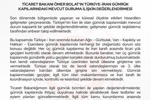 Bakan Bolat, Türkiye'nin İran ile olan gümrük kapılarındaki mevcut durum ile ilgili sosyal medya hesaplarından açıklamada bulundu. Bolat, gümrük kapılarındaki mevcut durumun kapsamlı bir şekilde değerlendirildiğini ve anbean gümrük teşkilatı tarafından takip edildiğini bildirdi. Bolat, Türkiye-İran sınırındaki Ağrı-Gürbulak, Van-Kapıköy ve Hakkari-Esendere gümrük kapılarında herhangi bir olağanüstü durumun söz konusu olmadığını açıkladı. "İran ile olan gümrük kapılarındaki mevcut durum anbean takip edilmektedir" Son dönemde bölgede yaşanan ve küresel ölçekte etkileri hissedilen gelişmelere değinen Bolat, "Türkiye'nin İran ile olan gümrük kapılarındaki mevcut durum kapsamlı bir şekilde değerlendirilmekte; gelişmeler gümrük teşkilatımız tarafından anbean takip edilmektedir. Bu kapsamda Türkiye-İran sınırında bulunan Ağrı-Gürbulak, Van-Kapıköy ve Hakkari-Esendere gümrük kapılarında herhangi bir olağanüstü durum söz konusu değildir. Her üç gümrük kapılarımız ile İran tarafı arasında ticari yük geçişleri kontrollü olarak devam etmektedir. Bununla beraber, her 3 gümrük kapılarında günübirlik yolcu geçişleri karşılıklı olarak durdurulmuş bulunmaktadır. İran kendi vatandaşlarının Türkiye üzerinden kendi ülkesine girişlerine izin vermektedir. Türkiye olarak biz de kendi vatandaşlarımızın ve 3'üncü ülke vatandaşlarının İran'dan ülkemize girişine izin vermekteyiz. Gümrük kapılarımızdaki geçişler, ilgili tüm idari makamlarımızca ve İran tarafı ile koordinasyon içinde, kontrollü ve kesintisiz şekilde devam etmektedir" dedi. "Tam koordinasyon içerisinde gerekli tedbirleri almaya kararlılıkla devam etmekteyiz" Bakan Bolat, aynı zamanda şu ifadelere yer verdi: "Ticaret Bakanlığımızın ilgili gümrük birimleri ile yapılan değerlendirmelerde; gümrük kapılarında ihtiyaç duyulması halinde alınabilecek ilave tedbirler ve eylem planları güncellenmektedir. İlgili tüm kamu kurumlarımız arasında koordinasyonun daha da güçlendirilmesi ve sahadaki kapasitenin artırılmasına yönelik hazırlıklar ele alınmaktadır. Bu doğrultuda gerekli tüm hazırlıklar yapılmış, personel takviyesi sağlanmış ve kontrol altyapısı güçlendirilmiştir. Türkiye'nin sınır geçiş hizmetlerinin ve ticaret akışının kesintisiz sürdürülmesi noktasında tüm birimlerimiz teyakkuz halinde görevini sürdürmektedir. Ticaret Bakanlığı olarak, gümrük kapılarımızdaki işleyişi yakından izlemeye; güvenli, düzenli ve hızlı geçişlerin sağlanması amacıyla ilgili tüm kurumlarımızla tam koordinasyon içerisinde gerekli tedbirleri almaya kararlılıkla devam etmekteyiz."