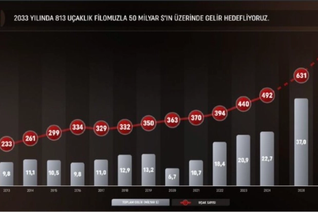 THY Genel Müdürü Bilal Ekşi, sosyal medya üzerinden yaptığı paylaşımda, THY'nin uçak filosuna ve gelirine ilişkin büyümesine ait tabloyu paylaştı. Tabloya göre, THY 2028'de toplam gelirini 37 milyar dolara, uçak sayısını 631'e çıkarmayı, 2033'te ise 813 uçaklık filoyla 50 milyar doların üzerinde gelir hedefliyor.