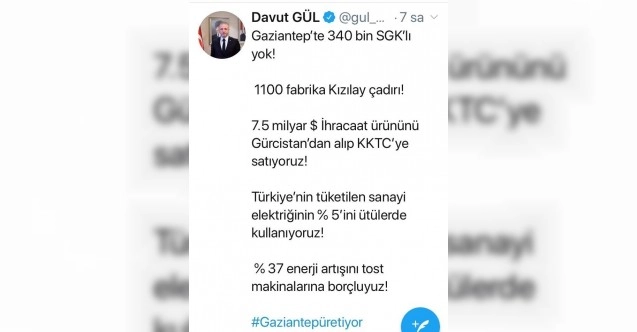 Gaziantep’te açılışı yapılan 300 fabrikanın bazılarının eski olduğu iddialarına tepki gösteren Vali Gül, "Gaziantep’te 340 bin SGK’lı yok. 1100 fabrika kızılay çadırı. 7.5 milyar dolar ihracat ürününü Gürcistan’dan alıp KKTC’ye satıyoruz! Türkiye’nin tüketilen sanayi elektriğini yüzde 5’ini ütülerde kullanıyoruz, yüzde 37 enerji artışını tost makinalarına borçluyuz” şeklinde imalı bir paylaşımda bulundu.