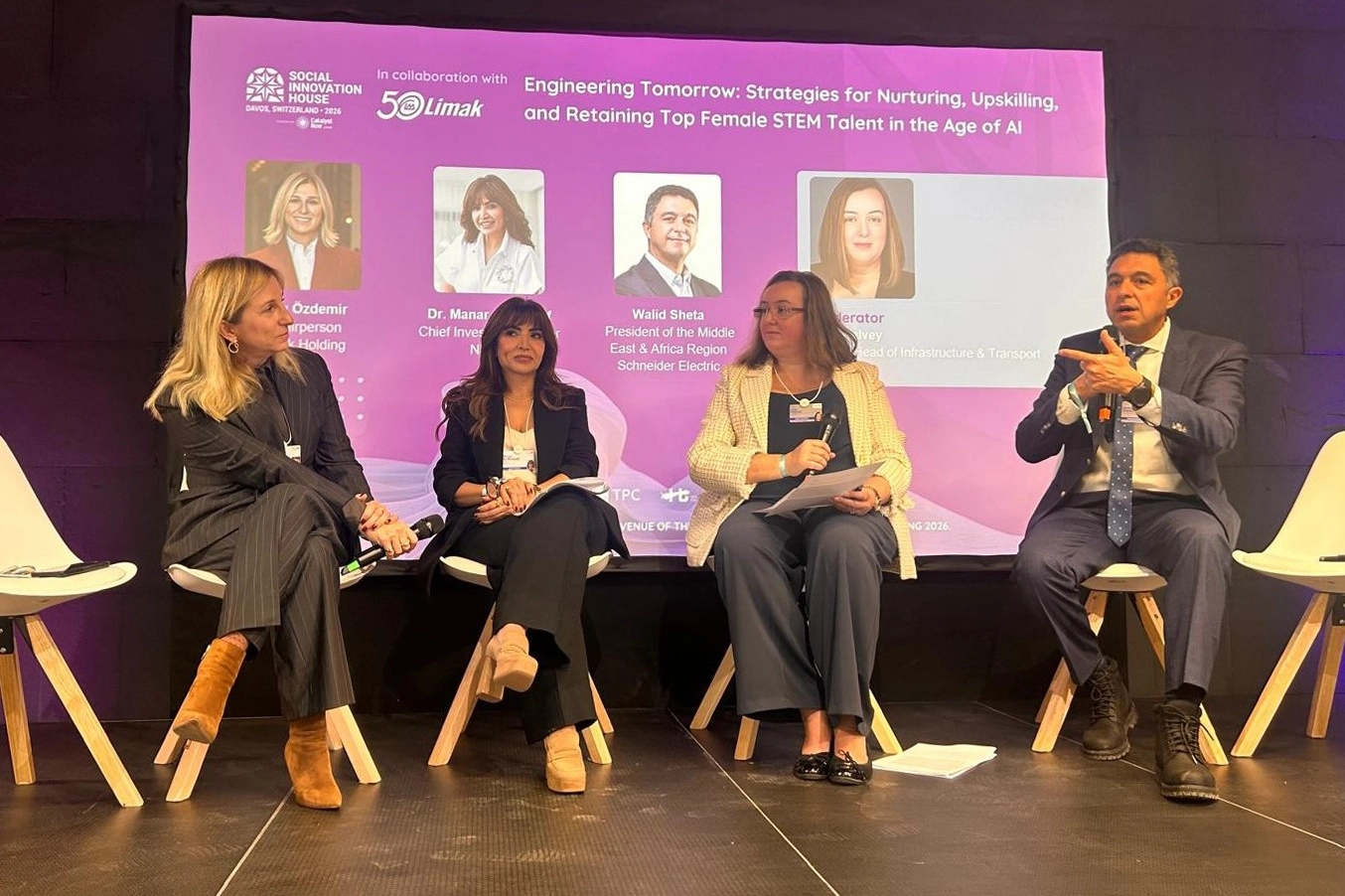 Kadınların STEM alanındaki stratejik rolünün ele alındığı ‘Yarını İnşa Etmek’ (Engineering Tomorrow) başlıklı panelde 11 yıldır aralıksız olarak sürdürülen Türkiye’nin Mühendis Kızları (TMK) ve projenin yurt dışı yapılanması Global Engineer Girls (GEG) girişimi Davos gündemine bir kez daha taşındı. İsviçre’nin Davos kasabasında düzenlenen Dünya Ekonomik Forumu’nun yıllık toplantısı kapsamında Limak Holding, akredite resmi programda yer alan ‘Yarını İnşa Etmek: Yapay Zekâ Çağında Kadın STEM Yeteneklerini Besleme, Geliştirme ve Elde Tutma Stratejileri’ (Engineering Tomorrow: Strategies for Nurturing, Upskilling, and Retaining Top Female STEM Talent in the Age of AI) başlıklı panel ile küresel iş dünyası liderlerini bir araya getirdi. Davos’taki TPC House’ta 20 Ocak 2026 tarihinde düzenlenen oturuma; Limak Holding Yönetim Kurulu Başkanı Ebru Özdemir ile birlikte Suudi Arabistan'ın iddialı projelerinden NEOM’un Baş Yatırım Sorumlusu (CIO) Dr. Manar AlMoneef ve Schneider Electric Orta Doğu ve Afrika (MEA) Bölge Başkanı Walid Sheta konuşmacı olarak katıldı. Dünya çapında kadınların iş hayatında ve liderlik pozisyonlarında ilerlemesini destekleyen en köklü sivil toplum kuruluşlarından biri olan Catalyst Now iş birliğinde, moderatörlüğünü KPMG Küresel Altyapı ve Ulaştırma Başkanı Lisa Kelvey’in gerçekleştirdiği panelde, yapay zekânın iş gücü üzerindeki etkileri ve dijital uçurumun derinleşmemesi için kadınların süreçlere eşit katılımı konuları ele alındı.