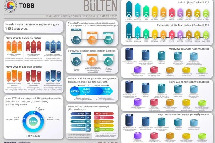 Mayıs 2025’te kurulan toplam 8 bin 956 şirket ve kooperatifin yüzde 87,8’i limited şirket, yüzde 10,1’i anonim şirket, yüzde 2,1’i ise kooperatif şirketi olarak kayıtlara geçti. Şirket ve kooperatiflerin yüzde 37,3’ü İstanbul, yüzde 11’i Ankara, yüzde ise 6,3’ü İzmir’de kurulurken, Mayıs ayında Ardahan’da şirket kuruluşu gerçekleşmedi.