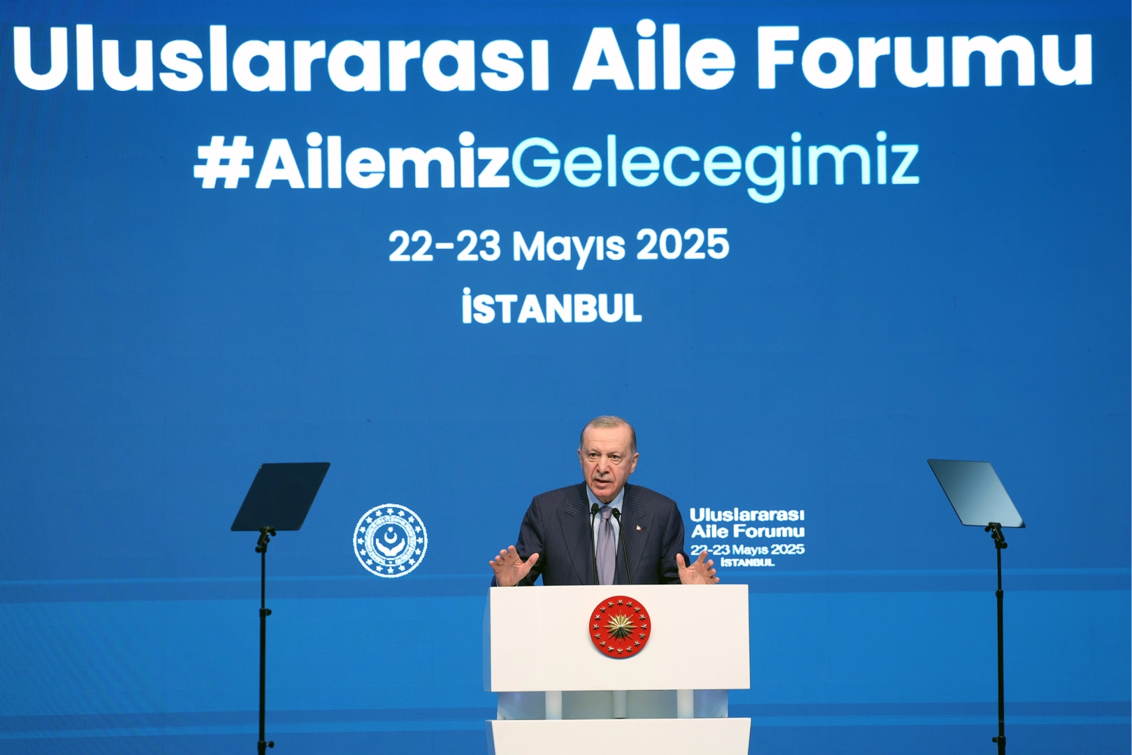 Forumda insanlığın geleceği adına hayati bir konunun ele alındığını belirten Cumhurbaşkanı Erdoğan, "26 ülkeden aileden sorumlu bakanların foruma iştirak ettiği bu forum devlet olarak aile müessesesine verilen önemin en somut işaretidir. Burada hepimizin bildiği şu gerçeğin altını çizmek isterim. Aile insanlık tarihinin ve insanlığın en önemli müesseselerinden biridir. Aile, en mukaddes varlığımız olma yanında toplumun da temel yapı taşıdır. Aile, yeri doldurulamayacak, yerine başka hiçbir kurum, ilişki veya bağ konulamayacak derecede mühimdir, değerlidir, kutsaldır. İlk insan Hazreti Adem babamız ve Hazreti Havva validemizden beri aile müessesesi vardır, hep olagelmiştir. On binlerce yıldır insanlar aile ortamında dünyaya gözlerini açmış, hayatı ilk orada öğrenmiş, ömürlerini bu şekilde idame ettirmiştir. Kadın ve erkekten oluşan aile müessesesi, insan neslinin devamı için de vazgeçilmez bir role sahiptir. Dolayısıyla aile, toplumu hem ayakta hem de bir arada huzur, güven, dayanışma ve kardeşlik içinde tutan bir çimentodur. Aile, fertleri bir arada tuttuğu kadar istikbalimizin teminatı olan çocukların da doğduğu, büyüdüğü, ilk eğitimlerini aldığı müşfik bir yuvadır. Tüm bunlarla birlikte aile, kadını koruyan, çocuğu büyüten, sosyalleştiren, insanı yaşatan bir yapıdır. Bakınız, tarih bize şu hakikati defalarca göstermiştir. Modernleşmeyi ailesizleşme ve yalnızlaşma gibi iki kavram üzerine bina eden anlayışın bireye de, topluma da huzur vermesi mümkün değildir. Ailenin çöktüğü, çözüldüğü, yıprandığı her toplum kökünden çürümeye, yozlaşmaya, çökmeye ve nihayetinde berhava olup gitmeye mahkumdur" dedi.