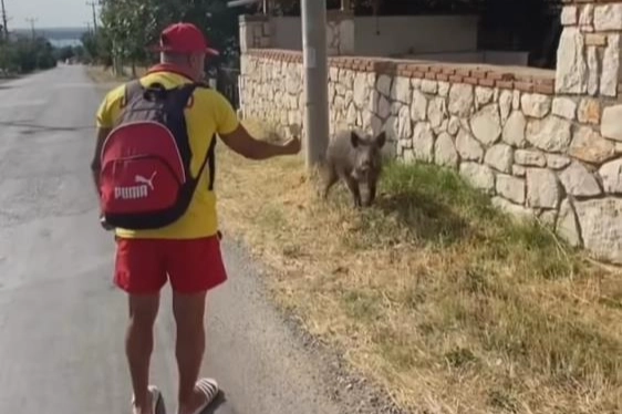 Aç kalarak Mudanya ilçesinde şehir merkezine kadar inen domuzu, bir vatandaş bisküvi ile besledi. Domuz ile sohbet eden vatandaş, o anları kayda aldı. Aç kalan domuz, bisküviyi yiyerek bölgeden uzaklaştı.