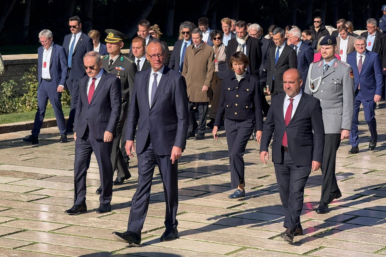 Almanya Federal Cumhuriyeti Şansölyesi Frederich Merz, Türkiye’de gerçekleştirdiği resmi temaslar öncesinde, Anıtkabir’i ziyaret etti. Resmi ziyaret kapsamında Ankara’ya gelen Almanya Şansölyesi Merz ve beraberindeki heyet Anıtkabir’e Aslanlı Yol’dan giriş yaptı. Atatürk’ün mozolesine Anıtkabir Komutanlığı’na bağlı askerlerin çelenk bırakmasının ardından saygı duruşunda bulunan heyet, Anıtkabir önünde fotoğraf verdi. Misak-ı Milli Kulesine beraberindeki heyet ile geçen Merz, Anıtkabir Özel Defterini imzaladı.
