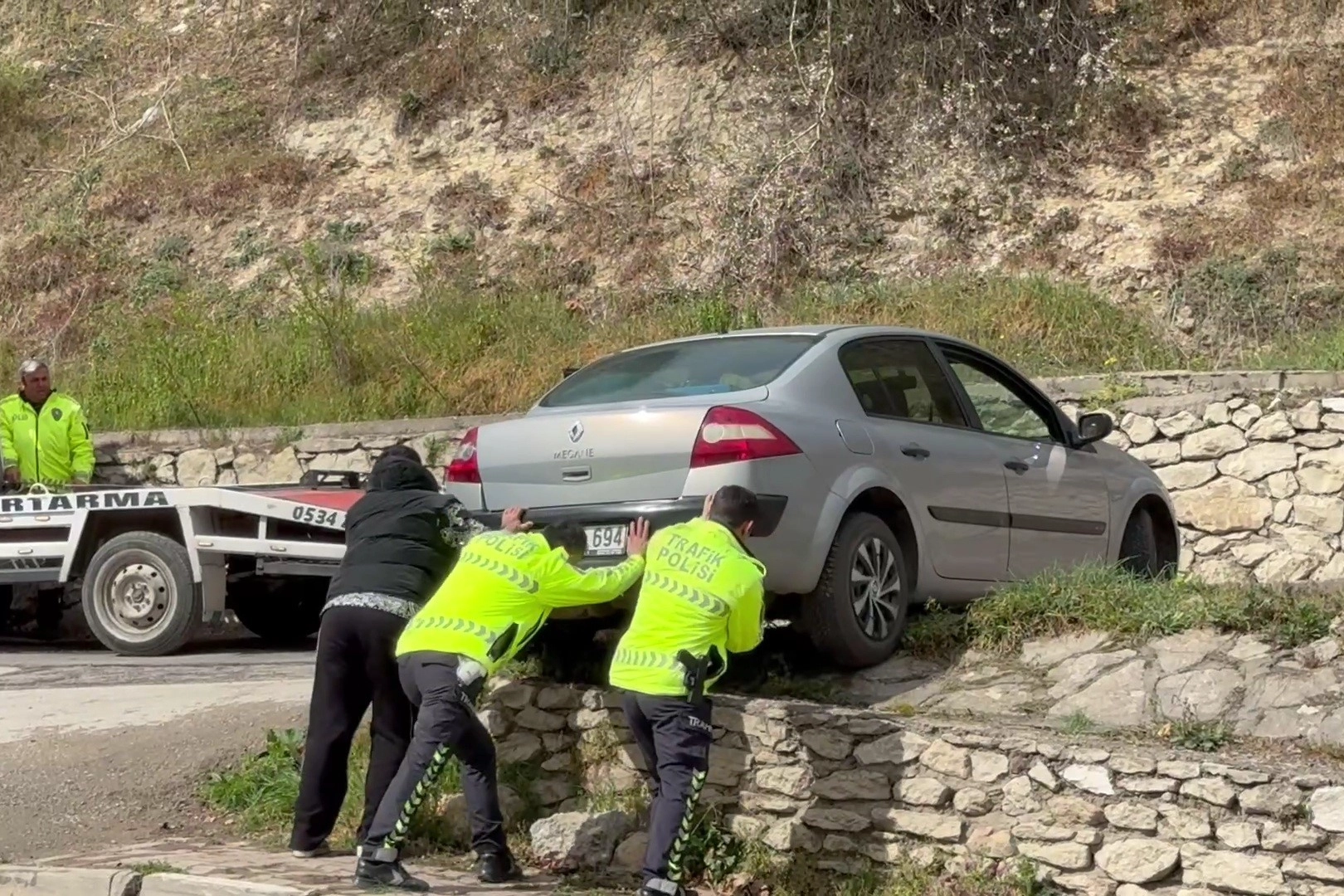 Kaza, Deretarla Sokak'ta meydana geldi. Sürücüsünün kontrolünden çıkan otomobil 1 metre yüksekliğindeki duvarda asılı kaldı. İhbar üzerine gelen trafik polisi ekipleri, çekici çağırdı. Sürücüyü direksiyon başına geçiren ekipler, otomobili arkadan iterek alt yola düşmekten kurtardı. Kazayı yara almadan ve aracında hasar oluşmadan atlatan sürücü polislere teşekkür etti.