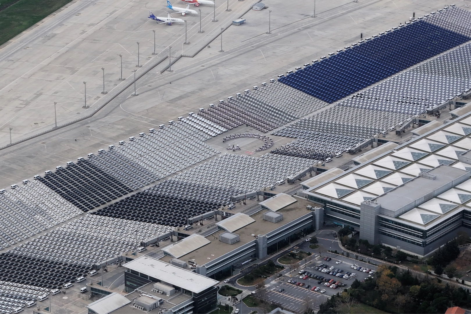 Sıfır araçlar, yarın Cumhurbaşkanı Erdoğan'ın katılacağı törenle güvenlik birimlerine teslim edilecek. Atatürk Havalimanı apronunda güvenlik birimlerine tahsis edilen binlerce hizmet ve destek aracı, Cumhurbaşkanı Recep Tayyip Erdoğan'ın katılacağı törenle yarın teslim edilecek. Jandarma , Emniyet ve Sahil Güvenlik Teşkilatına verilecek 9 bin 200 yeni araç, Atatürk Havalimanı apronuna sıralandı. Simetrik şekilde aprona dizilen araçlar, dron ile görüntülendi. Binlerce aracın ortasında oluşturulan Türk bayrağı motifi dikkat çekti.