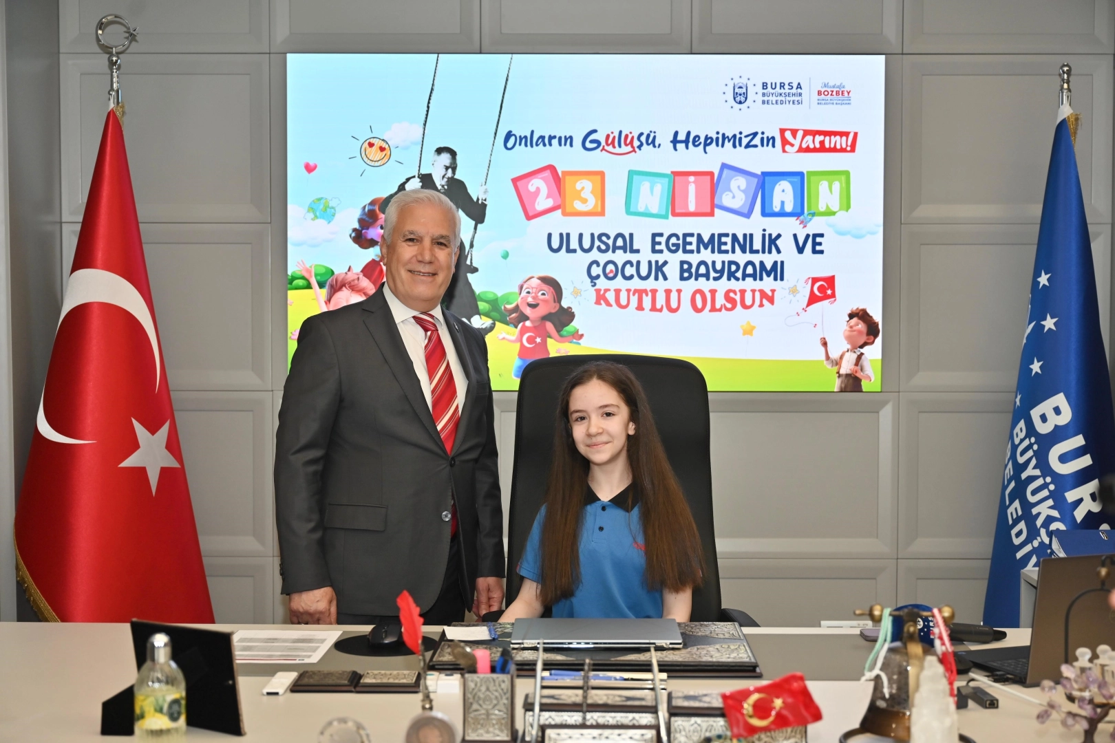 23 Nisan Ulusal Egemenlik ve Çocuk Bayramı’nda, geleceğin ülke ve kent yöneticileri başkanlık koltuklarını devraldı. Bursa Büyükşehir Belediye Başkanı Mustafa Bozbey de koltuğunu Dilek Özer Ortaokulu 7. sınıf öğrencileri Duru Tuna ve İlke Ormancı’ya devretti. Bursa Büyükşehir Belediyesi Hizmet Binası’nda düzenlenen devir teslim töreninde, geleceğin başkanlarına Büyükşehir Belediyesi Genel Sekreter Yardımcısı Mehmet Yıldız, okul müdürü Tayfun Şahin, sınıf öğretmenleri ve aileleri de eşlik etti.