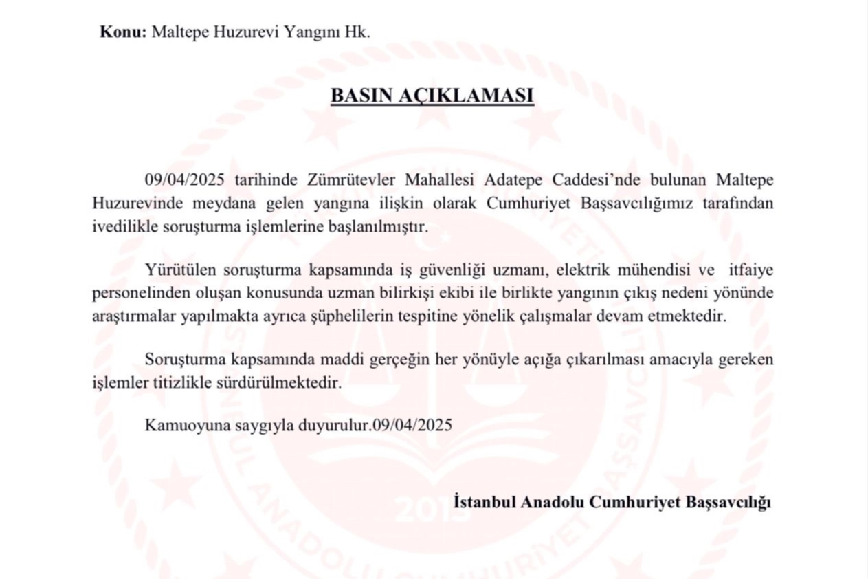 Yangın, 05.00 sıralarında Maltepe Huzurevi'nde meydana geldi. Huzurevinin içerinde bulunan özel bakım ünitesinde, sebebi henüz belirlenmeyen bir nedenle yangın meydana geldi. Paniğe neden olan yangında yapılan ihbarlar üzerine olay yerine çok sayıda itfaiye, ambulans, polis, AFAD ve UMKE ekipleri sevk edildi. İtfaiye ekiplerinin çalışmaları sonucu yangın kontrol altına alınırken, tedbir amaçlı olarak içerideki 90 kişi kurumun çok amaçlı salonuna tahliye edildi. Dumandan etkilenen 24 kişi çevredeki hastanelere kaldırıldı. Yangına ilişkin Anadolu Cumhuriyet Başsavcılığı tarafından yazılı basın açıklaması yapıldı. "Şüphelilerin tespitine yönelik çalışmalar devam etmektedir" Yapılan açıklamada, "09/04/2025 tarihinde Zümrütevler Mahallesi Adatepe Caddesi'nde bulunan Maltepe Huzurevinde meydana gelen yangına ilişkin olarak Cumhuriyet Başsavcılığımız tarafından ivedilikle soruşturma işlemlerine başlanılmıştır. Yürütülen soruşturma kapsamında is güvenliği uzmanı, elektrik mühendisi ve itfaiye personelinden oluşan konusunda uzman bilirkişi ekibi ile birlikte yangının çıkış nedeni yönünde araştırmalar yapılmakta ayrıca şüphelilerin tespitine yönelik çalışmalar devam etmektedir. Soruşturma kapsamında maddi gerçeğin her yönüyle açığa çıkarılması amacıyla gereken işlemler titizlikle sürdürülmektedir" ifadeleri kullanıldı.