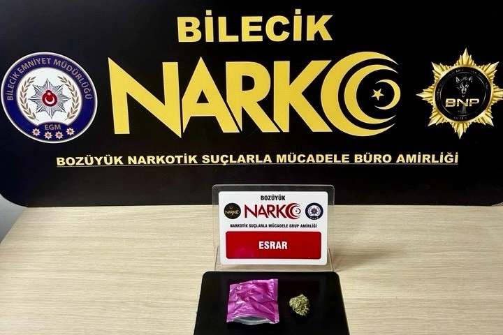 Bilecik İl Emniyet Müdürlüğü Narkotik Suçlarla Mücadele Şube Müdürlüğü Bozüyük Büro Amirliğince Bozüyük ilçesinde yürütülen çalışmalar kapsamında bir şahsın üzerinde ve çevresinde yapılan kontrollerde muhtelif miktarda esrar maddesi ele geçirildi. Olayla ilgili olarak ‘Kullanmak için uyuşturucu madde satın almak, kabul etmek veya bulundurmak’ suçundan 1 şüpheli şahıs gözaltına alındı. Olayla ilgili soruşturma başlatıldı.