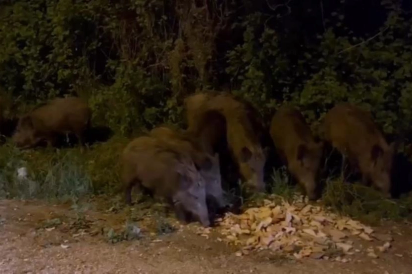 Merkez Nilüfer ilçesi Odunluk Mahallesi'ne aç kalan domuz sürüsü indi. O sırada araçlarıyla yoldan geçen bir aile domuz sürüsünü görünce durdu. Domuz sürüsünün yakınlarında duran aile bir süre sonra yoluna devam etti. Domuz sürüsü ise çöp konteynerlerinde yemek aradıktan sonra geldikleri ormanlık alana giderek gözden kayboldu.