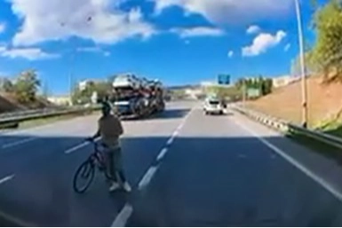Olay, Bursa-Yalova yolu üzerinde meydana geldi. Hızla ilerleyen araçlar, karşısında bisikletli vatandaşı görünce ne yapacağını şaşırdı. Kamyonların ve otomobillerin arasında sahilde yürürcesine ilerleyen bisikletli kişinin o anları bir otomobilin araç içi kamerasına yansıdı.