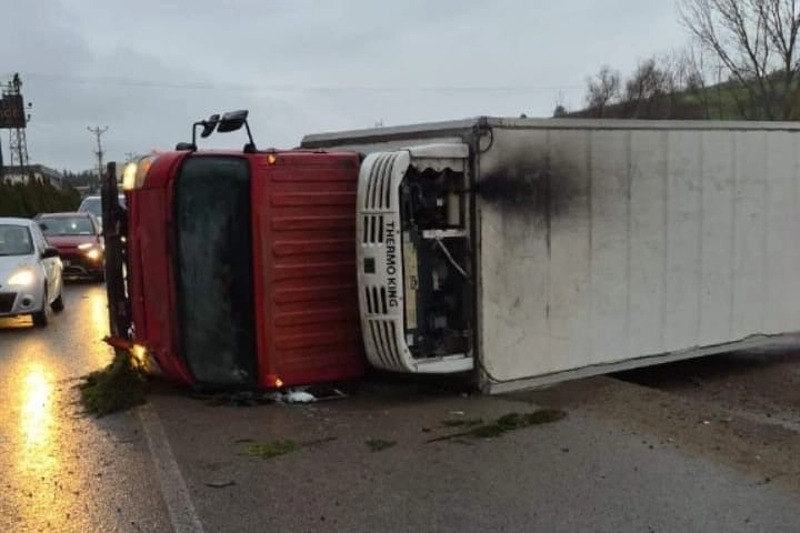 Kaza, Bursa-Ankara karayolu İnegöl girişinde meydana geldi. Edinilen bilgiye göre, Bursa'dan İnegöl istikametine seyir halinde olan Hasan Ş. (52) yönetimindeki 16 J 9995 plakalı kamyon, sürücüsünün direksiyon hakimiyetini kaybetmesi sonucu yol kenarında bulunan bir içecek fabrikasının duvarına çarptı. Çarpmanın etkisiyle kamyon devrildi.