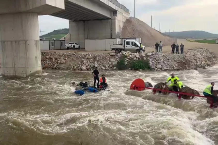 Bursa’nın Yenişehir ilçesinde Kocasu Deresi’nden traktörle karşıya geçmek isteyen 10 işçinin bulunduğu traktör, suyun ortasında devrildi. Akıntının etkisiyle dengesini kaybeden traktördeki işçiler dere içinde mahsur kaldı. Olayın ardından bölgeye Bursa Büyükşehir Belediyesi İtfaiye Daire Başkanlığı ekipleri, jandarma, AFAD ve Yenişehir arama kurtarma ekipleri sevk edildi. Ekipler, suyun debisi ve zemin şartlarının zorluğu nedeniyle kurtarma çalışmalarını kontrollü şekilde yürüttü. Bölge sakinlerinin de destek verdiği çalışmalarda, mahsur kalan işçilere halatlar ulaştırıldı. Dakikalar süren müdahalenin ardından olay yerine getirilen vinç yardımıyla işçiler tek tek bulundukları noktadan çıkarıldı. Kurtarma anları ise cep telefonu kameralarına yansıdı. Görüntülerde ekiplerin koordineli çalışması ve işçilerin vinç yardımıyla güvenli alana alındığı anlar yer aldı. Faciadan dönülen olayda 10 işçinin sağlık durumlarının iyi olduğu öğrenilirken, olayla ilgili inceleme başlatıldı.