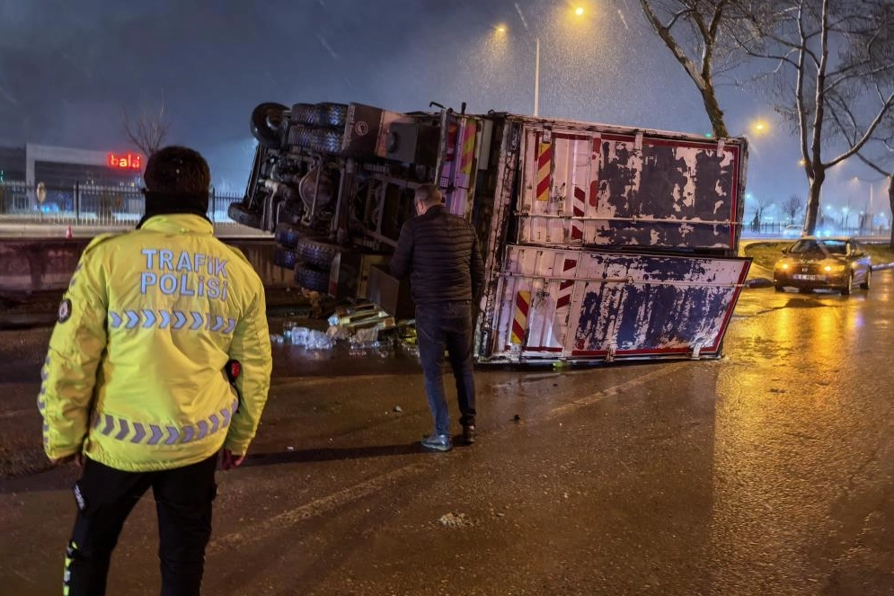 Kaza, saat 19.00 sıralarında Bursa-Ankara karayolu üzeri İnegöl girişinde meydana geldi. Bursa'dan İnegöl'e seyir halinde olan Bünyamin B. (47) idaresindeki 16 AVD 445 plakalı içecek yüklü kamyon, sürücüsünün kontrolünden çıkarak alt yola devrildi. Kazada sürücü yaralanmazken, dorsede bulunan tüm şişeler kırıldı. Araç çekici yardımıyla 2 saat süren çalışma sonucu kaldırıldı. Polis kaza ile ilgili soruşturma başlattı.