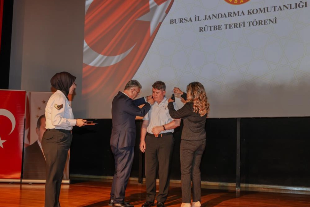 Vali Erol Ayyıldız’ın katıldığı törende bir üst rütbeye yükselen jandarma personeline yeni rütbeleri takdim edildi. Tuğgenerallikten tümgeneralliğe terfi eden Bursa İl Jandarma Komutanı İdris Tataroğlu'nun yeni rütbesini de Bursa Valisi Erol Ayyıldız taktı. Bursa İl Jandarma Komutanlığı’nda görev yapan personelin rütbe terfi töreni, Bursa Valisi Erol Ayyıldız, il protokolü ve personelin ailelerinin katılımıyla gerçekleştirildi. Uludağ Üniversitesi Prof. Dr. Mete Cengiz Kültür Merkezi’nde düzenlenen törende bir üst rütbeye yükselen jandarma personeline yeni rütbeleri takdim edildi. Terfi eden personeli tebrik eden Vali Ayyıldız, jandarmanın fedakârca görev yaptığını vurgulayarak başarılarının devamını diledi. Başarılı çalışmalara imza atan Bursa İl Jandarma Komutanı İdris Tataroğlu da kararname ile üst rütbeye terfi etmişti. Tümgeneral olan Tataroğlu'nun yeni rütbesini Vali Ayyıldız ve eşi Fatma Tataroğlu taktı