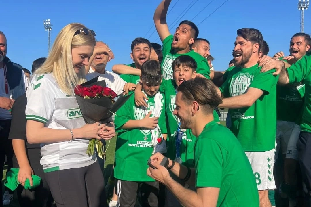 Kestel Belediyespor geçtiğimiz pazar günü Atıcılar Veysel Karani Sahası'nda oynanan Küplüpınar Yeşildağspor karşılaşmasını 3-0 kazanarak adını Bölgesel Amatör Lig'e (BAL) yazdırdı. Kestel Belediyespor forması giyen 24 yaşındaki tecrübeli kanat oyuncusu Hafız Görkem Vardar, maçın bitiminde kız arkadaşına sahada evlenme teklifinde bulundu. Evet cevabının ardından takım arkadaşları tarafından alkışlarla tebrik edilen genç çift, evlilik yolunda ilk adımı yeşil sahalarda atmış oldu.