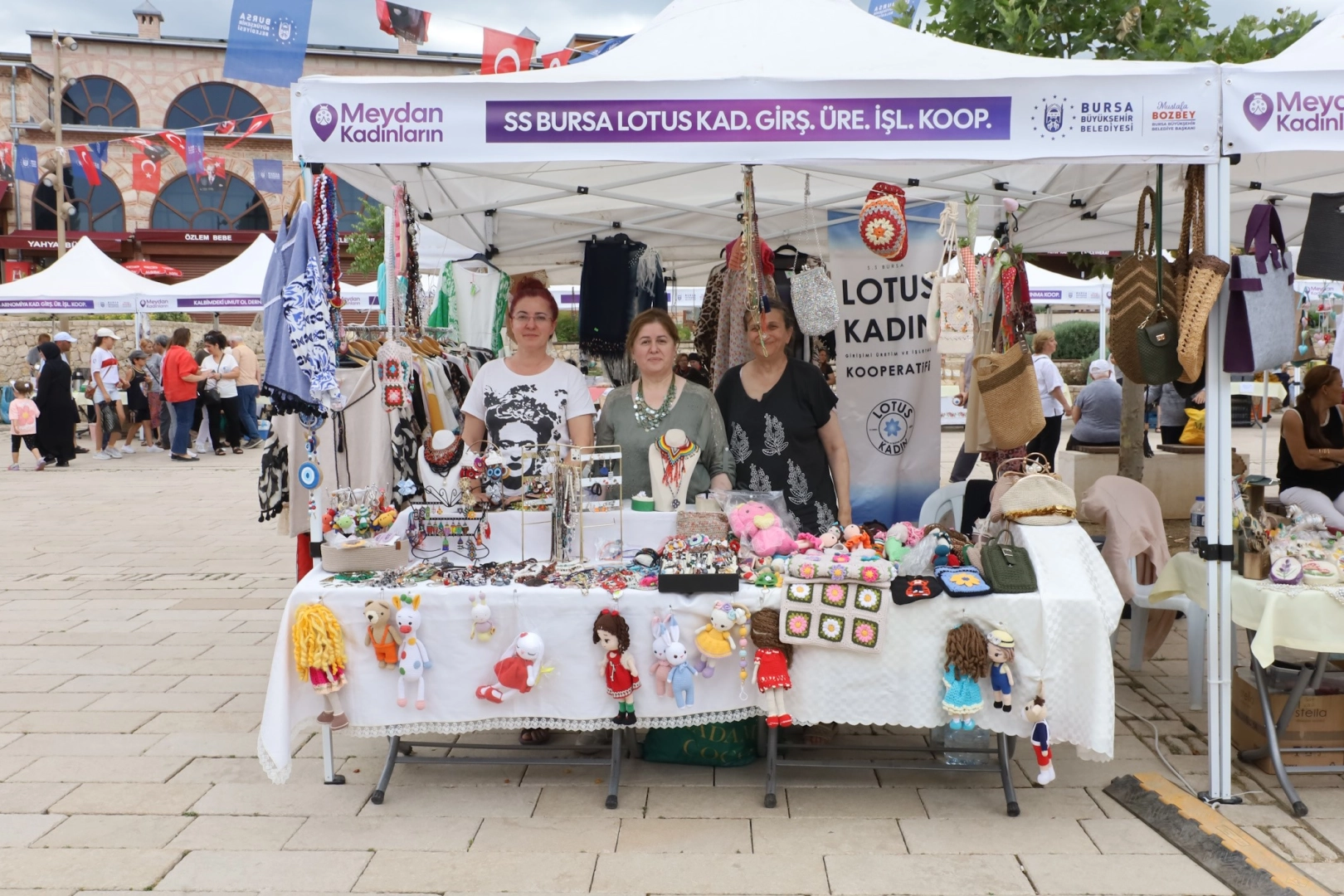 ‘Geçinen ve gülümseyen Bursa’ hedefiyle üreten kadınları her zaman destekleyen Büyükşehir Belediyesi, Çarşıbaşı’nda düzenlediği etkinlikte 33 kadın kooperatifi ve kadın derneğinin el emeği ürünlerini ve yöresel lezzetlerini sergilemesine imkan sağladı. ‘Meydan Kadınların’ temasıyla yapılan etkinliğe, Bursalılar yoğun ilgi gösterdi. Aile, Kadın ve Çocuk Hizmetleri Şube Müdürlüğü tarafından kurulan ritim grubu da verdiği konserle vatandaşlara keyifli anlar yaşattı.