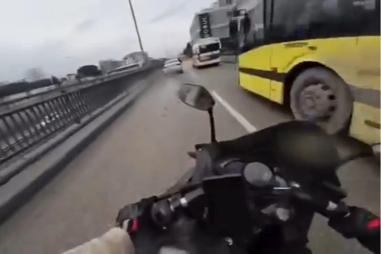 Olay, merkez Yıldırım ilçesi Ankara yolu üzerinde meydana geldi. Biranda hızlanan motosiklet sürücüsü, otobüse çarpmamak için solundan giden otomobilin önüne geçtiği an direksiyon hakimiyetini kaybetti. Sağa ve sola doğru yalpalayan motosiklet, sürücüsü kısa bir süre sonra direksiyonu toplamasıyla yoluna devam etti. Yaşanan korku dolu anlar, motosikletlinin kask kamerasına yansıdı.