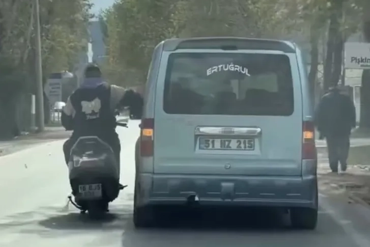 Sürücülerin tehlikeli hareketleri kameralara yansıdı. Edinilen bilgiye göre, Osmangazi ilçesinde seyir halinde olan motosiklet sürücüsü, yolda karşılaştığı ticari aracın sürücüsü olan arkadaşıyla sohbet etmek istedi. Sohbete dalan sürücü, bir kolunu aracaya yaslayıp diğer eliyle motosikleti sürmeye devam etti. Trafiği ve kendi canını hiçe sayan sürücülerin bu tehlikeli yolculuğu, cep telefonu kamerasıyla anbean kaydedildi.