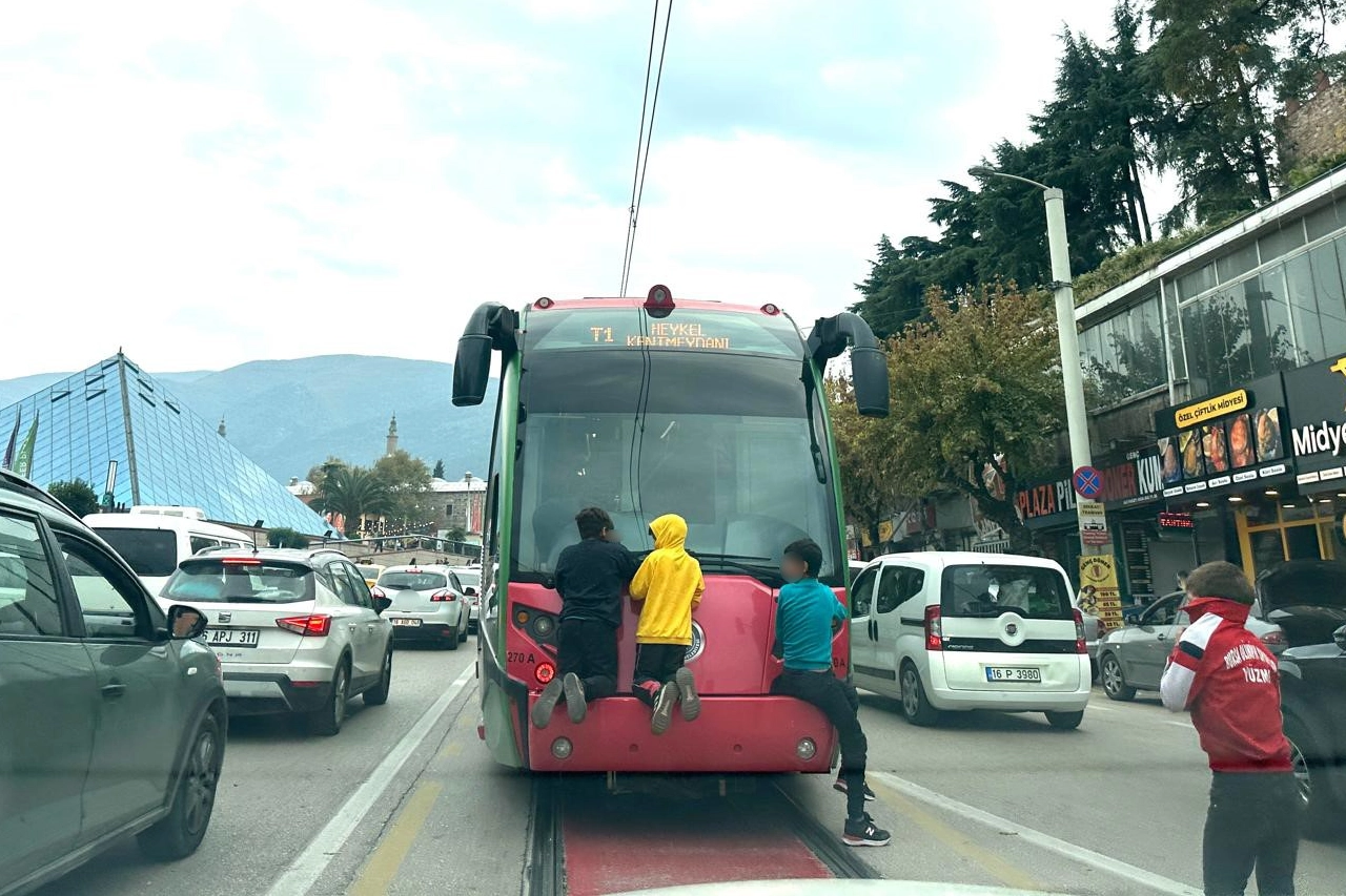 Her an ölümle burun buruna gelen çocukların tehlikeli yolculuğu, başka bir aracın kamerasına yansıdı. Olay, merkez Osmangazi ilçesinde meydana geldi. Dört çocuk, hareket halindeki bir tramvayın arkasına tutunarak dakikalarca yolculuk yaptı. Trafikte ilerleyen çocukların rahat tavırları pes dedirtirken o anları gören sürücüler büyük şaşkınlık yaşadı. Her an düşüp ağır şekilde yaralanma riski taşıyan çocukların tehlikeli yolculuğu cep telefonu kamerasıyla kaydedildi. Görüntülerde tramvayın arkasına sıkı sıkıya tutunan çocukların uzun süre bu şekilde ilerlediği anlar yer aldı.