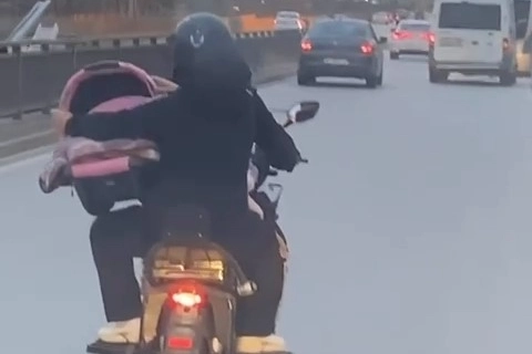 Olay, merkez Yıldırım ilçesi Hacivat Mahallesi'nde meydana geldi. Edinilen bilgiye göre, seyir halinde olan plakasız motosiklet sürücüsü eşi ve bebeğini yanına alarak ilerledi. Eşinin taşıdığı bebeği pusette götüren sürücü, işlek caddeye aldırış etmeden ilerledi. O anlar bir vatandaşın cep telefonu kamerasıyla görüntülendi.