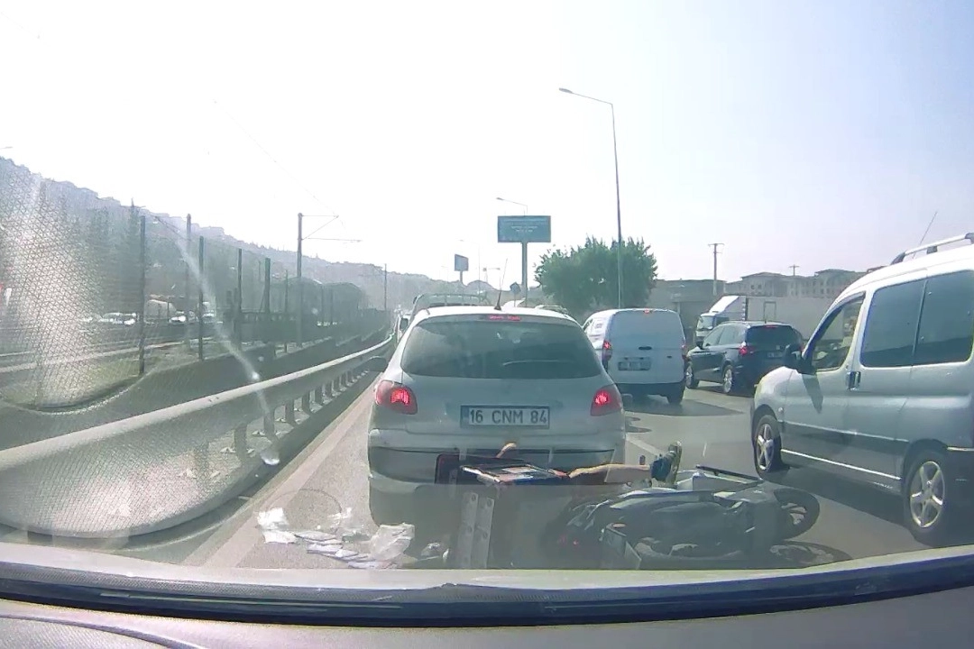 Kontrolden çıkan motosikletler yola savrulurken, kazaya ait anlar araç içi kamerasına saniye saniye yansıdı. Osmangazi ilçesi İzmir Yolu Caddesi üzerinde meydana gelen olayda, yoğun trafikten kaçmak isteyen motosikletlilerin trafik kurallarını hiçe sayarak şerit değiştirdiği ve araçların arasından ilerledikleri görüldü. İki motosikletlinin birbirine çarpmasıyla yere savruldukları anlar araç içi kamerasına yansırken, savrulan sürücülerin yardımına çevredekiler koştu. Şans eseri ufak sıyrıklarla atlatılan kazayla ilgili tahkikat başlatıldı.