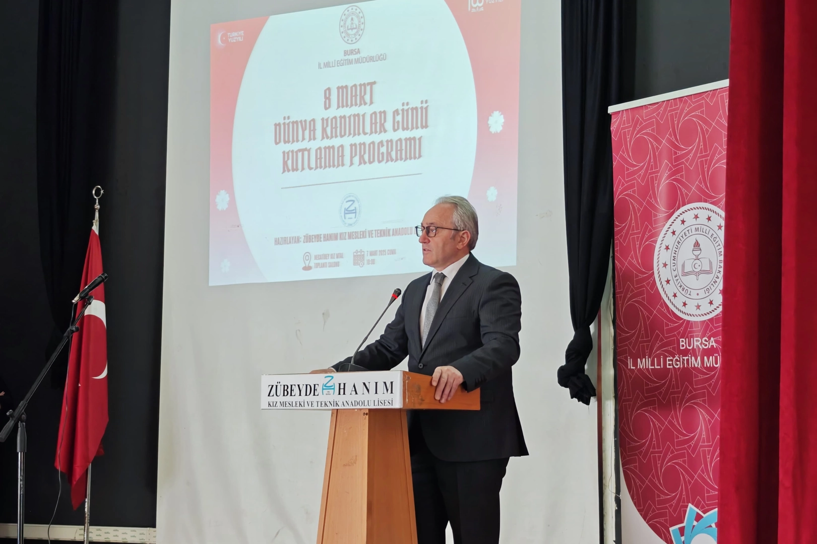 Etkinliğe Bursa İl Millî Eğitim Müdürü Dr. Ahmet Alireisoğlu, il ve ilçe millî eğitim yöneticileri, öğretmenler ve öğrenciler katıldı. Konuşmasında kadınların toplumdaki vazgeçilmez rolüne vurgu yapan Alireisoğlu, Neşet Ertaş’ın “Kadın insandır, biz ise insanoğluyuz” sözünü hatırlatarak, tarih boyunca kadınların büyük başarılara imza attığını belirtti. Hz. Hatice ve Hz. Ayşe gibi önemli kadın figürlerinin toplumsal gelişime katkılarına değinen Alireisoğlu, gençlere hitaben, “Ne yapmak istiyorsanız, en iyisini yapmaktan vazgeçmeyin, mücadelenizi sürdürün,” dedi. Gençleri başarıya odaklanmaya teşvik eden Alireisoğlu, “En iyi yaptığınız şeyi hayal edin ve bunun için pes etmeyin,” diyerek konuşmasını tamamladı.