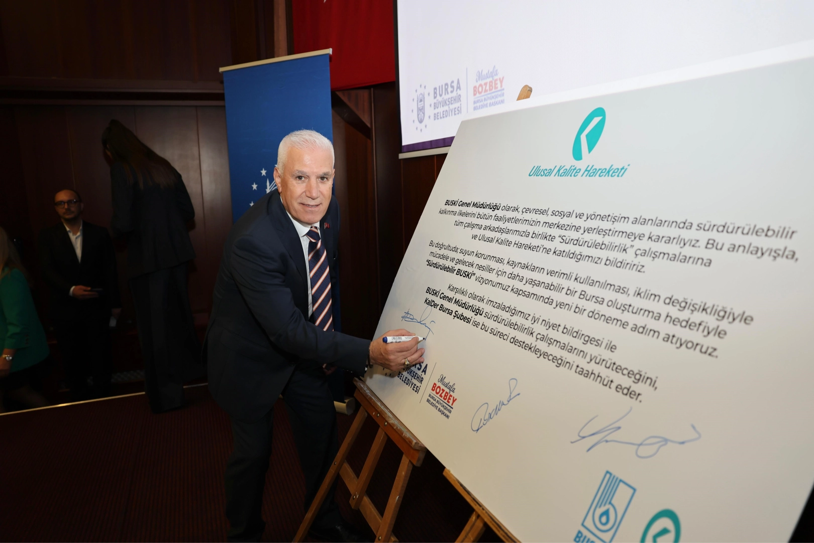 Büyükşehir Belediyesi’nde olduğu gibi, süreci BUSKİ’de de sürdürülebilirlik odağıyla, aynı kararlılık ve disiplinle yöneteceklerini belirten Başkan Mustafa Bozbey, "EFQM modeliyle işlerin nasıl, ne zaman ve kim tarafından yapılacağının netleştiğini, maliyetlerin düştüğünü, teknik kalitenin arttığını, zaman yönetiminin iyileştiğini ve en önemlisi vatandaş memnuniyetinin belirgin biçimde yükseldiğini deneyimleyeceğiz. KalDer ile bugün attığımız imza; suyun bu topraklarda bir damlasının bile heba edilmemesi için atılmış bir imzadır. Hep birlikte, daha iyiye, daha sürdürülebilir ve daha güçlü bir Bursa’ya doğru yürümeye devam edeceğiz" dedi.