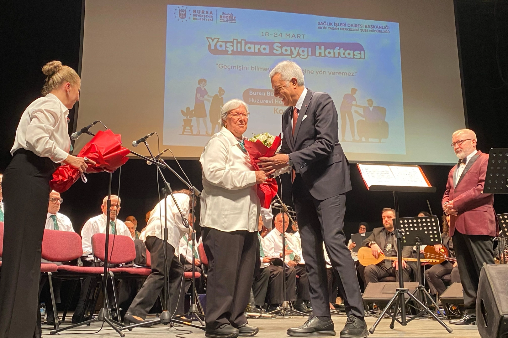 18-24 Mart tarihleri arasında kutlanan Yaşlılara Saygı Haftası kapsamında Bursa Büyükşehir Belediyesi Sağlık İşleri Dairesi Başkanlığı Aktif Yaşam Merkezleri Şube Müdürlüğü tarafından çeşitli etkinlikler düzenlendi. Heykel Atatürk Anıtı’na çelenk sunumu ile başlayan programlar, Tayyare Kültür Merkezi’ndeki sergi ve konserle devam etti. Huzurevi sakinlerinin hazırladığı eserlerin yer aldığı serginin açılışına, Büyükşehir Belediyesi Genel Sekreter Yardımcısı Mehmet Yıldız, Sağlık İşleri Dairesi Başkanı Düşünsel Şentürk, büyükşehir bürokratları ve huzurevi sakinleri katıldı. Sergiyi gezen Genel Sekreter Yardımcısı Mehmet Yıldız, eser sahiplerinden bilgi alarak çalışmalarından dolayı tebrik etti. Serginin ardından Yaşlılara Saygı Haftası etkinlikleri, ‘Huzurevi Korosu’ konseriyle sürdü. Solo ve koro halinde eserleri seslendiren huzurevi sakinleri, sergiledikleri başarılı performansla dinleyenlerden büyük alkış aldı. Konser sonunda konuşan Genel Sekreter Yardımcısı Mehmet Yıldız, huzurevi sakinlerinin sanat yoluyla kendilerini ifade etmelerine imkan sağlayan herkese teşekkür etti. Bursa Büyükşehir Belediye Başkanı Mustafa Bozbey’in kentte yaşayan herkesin mutlu ve huzurlu olmasına büyük önem verdiğini belirten Yıldız, “Huzurevi sakinlerimiz, tecrübeleri ve birikimleriyle bizlere yol gösteriyor ve ilham kaynağı oluyor. Bursa Büyükşehir Belediyesi olarak halkımızın huzurlu, mutlu ve sağlıklı bir hayat sürdürebilmesi için hizmet etmeye devam ediyoruz” dedi.