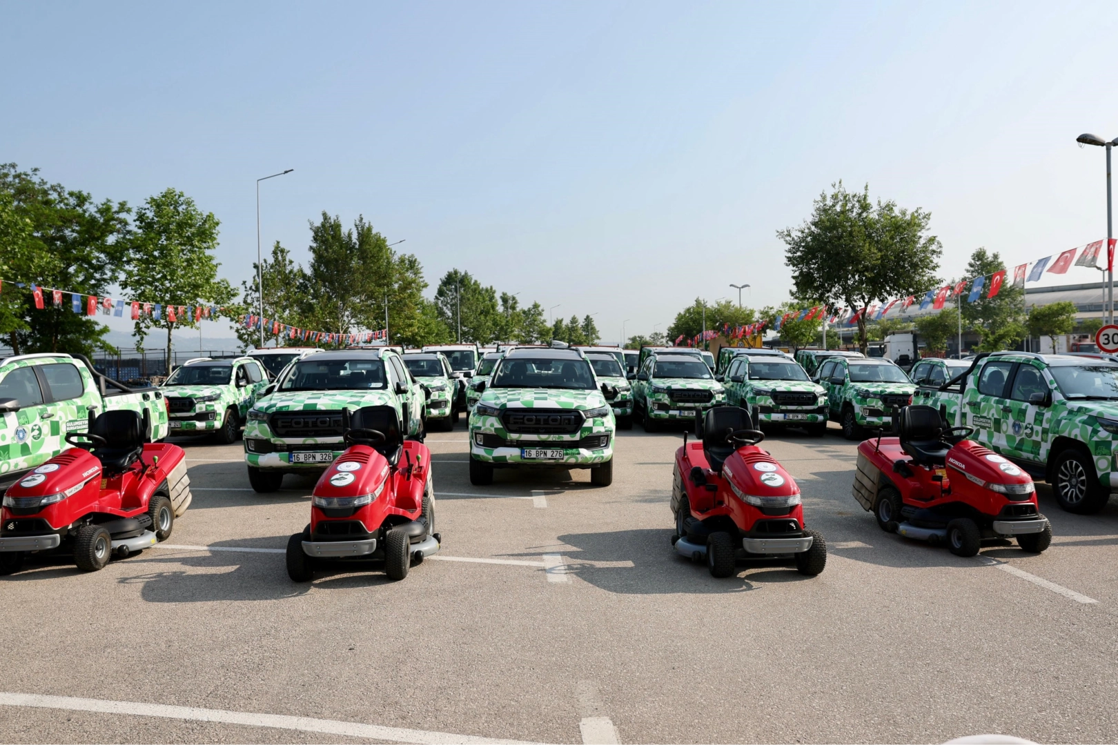 ‘Yeniden Yeşil Bursa’ hedefiyle çalışmalarını kararlılıkla sürdüren Büyükşehir Belediyesi, faaliyetleri daha etkili ve verimli yürütebilmek adına ekipmanları, araçları ve teknik imkânları güçlendirmeye devam ediyor. Bu kapsamda Bursa’nın yeşil alanlarının bakımını çevreci ve hızlı bir biçimde yapabilmek adına Tarım Peyzaj A.Ş. bünyesine kazandırılan yeni araçlar düzenlenen törenle hizmete alındı. Yaklaşık 1100 çalışan, 195 ekipman ve 174 araçlık filosuyla kentin dört bir yanında görev yapan Tarım Peyzaj AŞ’nin filosuna, 5 yeni kamyon ve tanker, 13 adet 4x4 pick-up, 16 adet çift kabin kamyonet, son teknoloji çim biçme traktörleri, çim biçme araçları ve ilave biçme motorları eklendi.